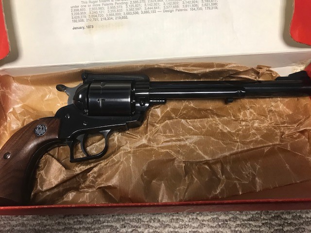 Gorgeous condition! Here's a Ruger New Model Super Blackhawk revolver that was manufactured in 1976 and specially rollmarked "Made in the 200th Year of American Liberty" along the top of the barrel. The left side of the barrel has the simple Ruger address rollmarking, no "warning". A large single-action revolver, this Ruger chambers the .44 Magnum and wears a 7-1/2" barrel with adjustable rear sight. This revolver is in outstanding condition and appears little more than factory test fired. The cylinder is properly numbered to the frame with numbers etched on the front face. The original blue finish rates 96-98% with just a cylinder turn line. The balance of the gun is nearly flawless. There is no rust or pitting. The original walnut grips are excellent, free of cracks, chips, dings or wear. The mechanics are in perfect working order and the bore is excellent! This handsome revolver comes in an .44 original red cardboard box which doesn't number to the gun (the box does show some wear). A very nice Ruger revolver.