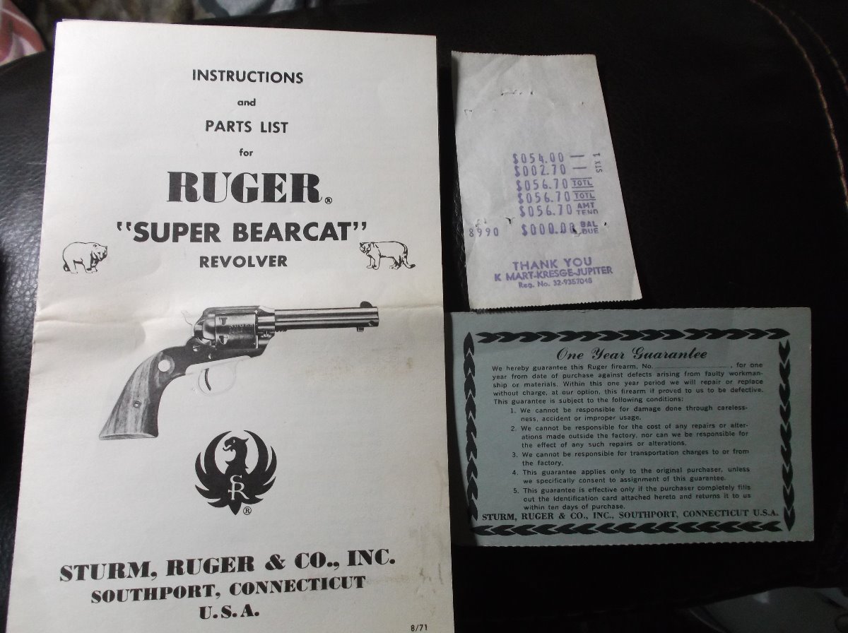 Little gem is in excellent condition, engraving is perfect, no holster wear, have original box, receipt from K Mart, and manual. Asking $700 for this great little Super Bearcat.