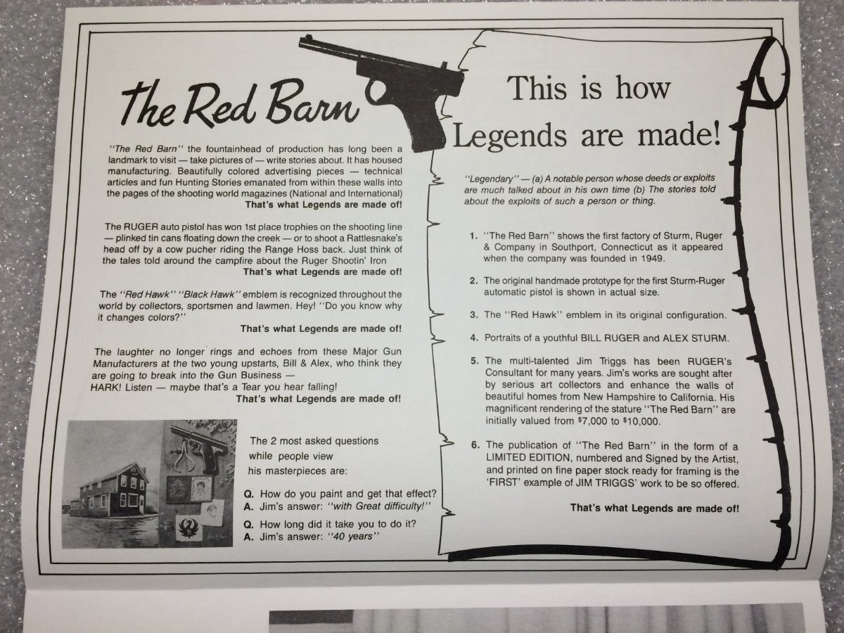 I will work on digging out more Red Barn memorabilia this evening as I'm certain there is more here in my collection besides what's been shown above. Here's the original black and white advertisement for a special limited signed and numbered to 1500 run of The Red Barn print by James Triggs. This link viewtopic.php?t=864 will show you the actual print #258 owned by one of our members. This print was a Christmas offering from 1986. There is a red color version of this brochure as well but I can't seem to find mine at this time. If anyone is willing to part with one of these prints please contact me! I don't care what number it is but I would love to have one on the wall.