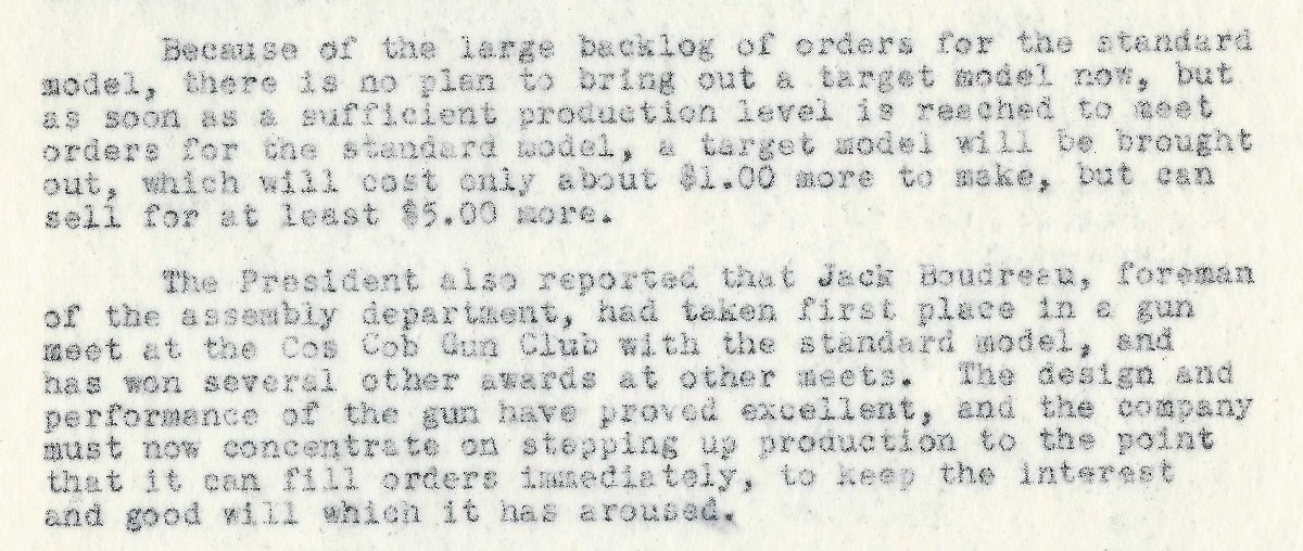 Excerpt from 2/21/1950 share-holder's meeting. Message from Bill Ruger. The pistol Boudreau was shooting in these matches was Standard Auto serial number 3.