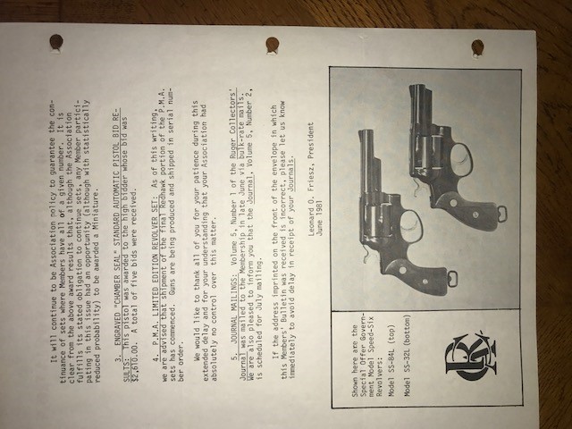 I hope you have found more information on your search for a SS32L. I have provided some additional information below in the form of attachments. The SS32L a 2 3/4" .357 issued in 1981 was part of a pair (1 of 2) military pieces, the other being the SS84L a 4" .38 speed six. The revolvers are modified speed sixes, factory equipped with stainless steel trigger and hammer and government spec lanyard loop. They have a fixed site frame and round butt grip and nicely checkered walnut grip panels.