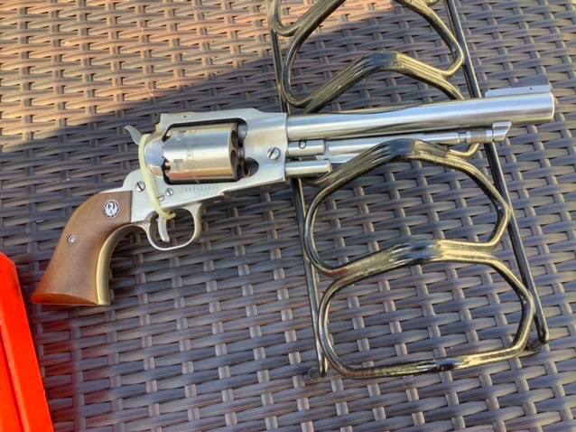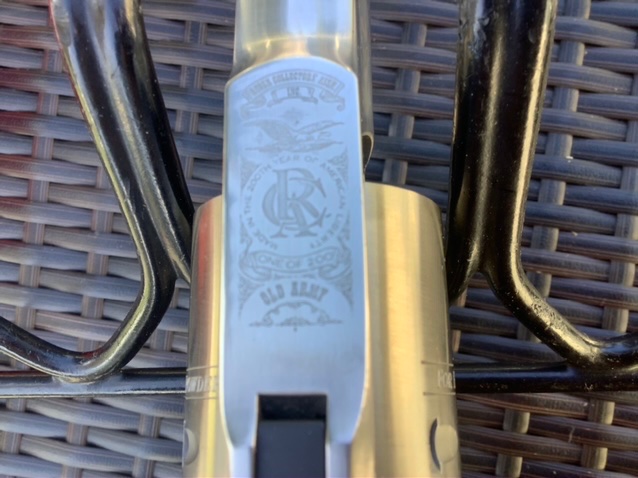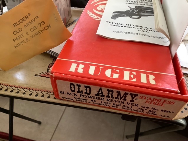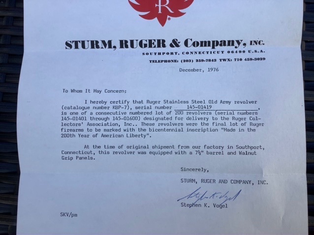 New condition, Old Army Stainless. One of 200 pieces produced for RCA, marked with the bicentennial inscription “Made in the 200th Year of American Liberty”. 7 1/2” barrel and walnut grip panels. Original box, papers, nipple wrench, and copy of confirmation letter from Sturm Ruger. OTD. $1,100