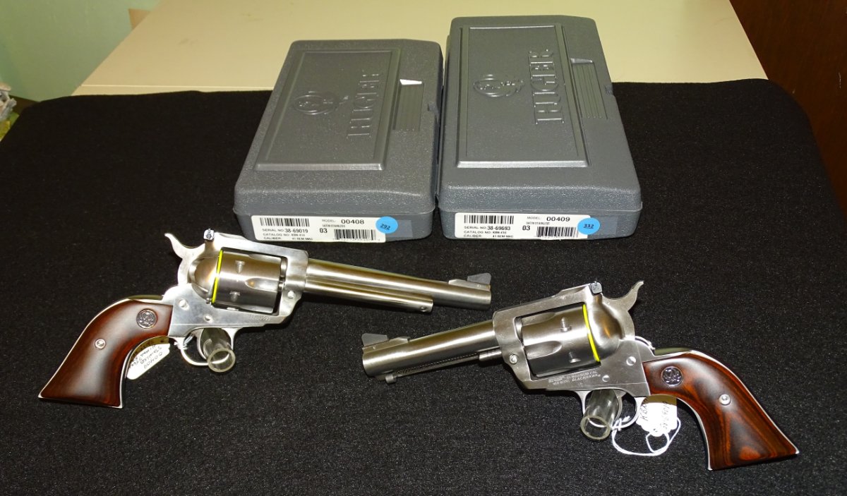 In my quest to collect the .41mag. Blackhawk I have never run a crossed one made in stainless steel, until now. These two are Davidson's exclusives, a 6.5" and a 4.62"! Also, the only Ruger logo is on the rear sight, not on the frame or barrel. The serial numbers on both guns start with 38-, this prefix was, is, used on the .357mag. Davidson sold these to their dealers in 2018. They only produce 125 of the 4.62" and 119 of the 6.5". Both guns are new in the box with all their paper work.