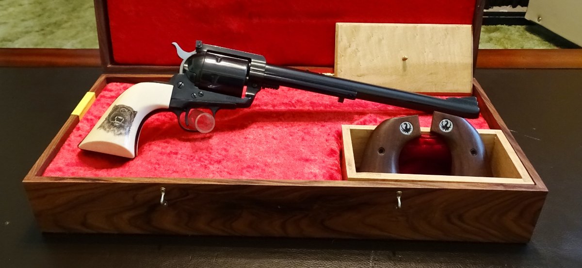 The ivory grip panels are for an XR3RED frame, so I thought they would look great on this Hi-Polished Flat-Top. They have a "Scrimshawed" Wolverine in the right panel.
