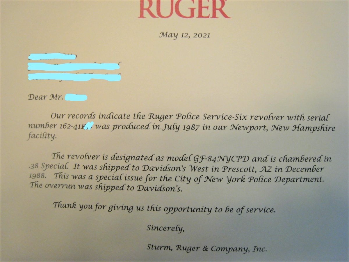 The Ruger letter arrived yesterday confirming it's a GF-84 NYCPD special contract overrun shipped directly to Davidsons West in Prescott, AZ. Ten dollars for this information was money well spent IMO. I found a "new" old stock Sile walnut grip that works better than the original for me and looks better than rubber. Is it true Sile used to make some of the Six Series grips for Ruger?