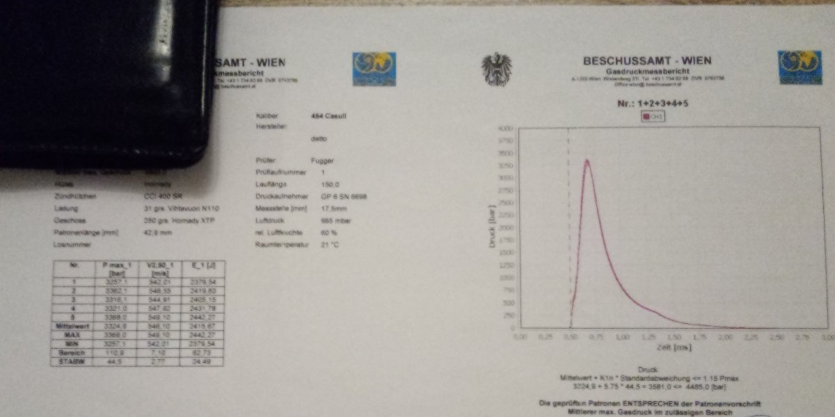 After more than a year of waiting, my protocols regarding the gas pressure of my 480 Ruger charges with vihtavuori powders have arrived, which of course I would like to show you. Please excuse that the information is in metric units, this is due to the authorities in my home country.