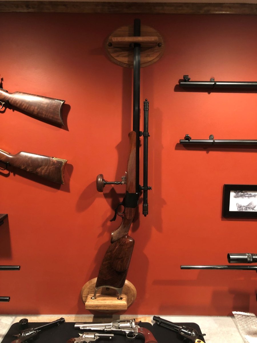 here's a picture of my latest acquisition off GB. Its a hoot to shoot. Custom built by the late BW Darr and is chambered for the traditional Schuetzen cartridge 32-40. I added a canjar trigger that I had laying around and a Malomb 6x scope to it, other than that it's just the way Barry set it up. Just finished the gun rack for it, so decided to post it.