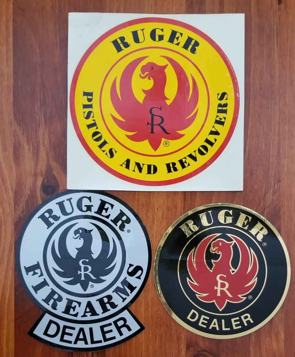Extremely rare Ruger Pistols and Revolvers Decal and two rare dealers decals. The Pistols and Revolvers Decal is marked 1957 on back. Due to being paper less of these survived versus the rare patches. $160 for all three mailed to you. First I'll take it followed by a PM gets them.