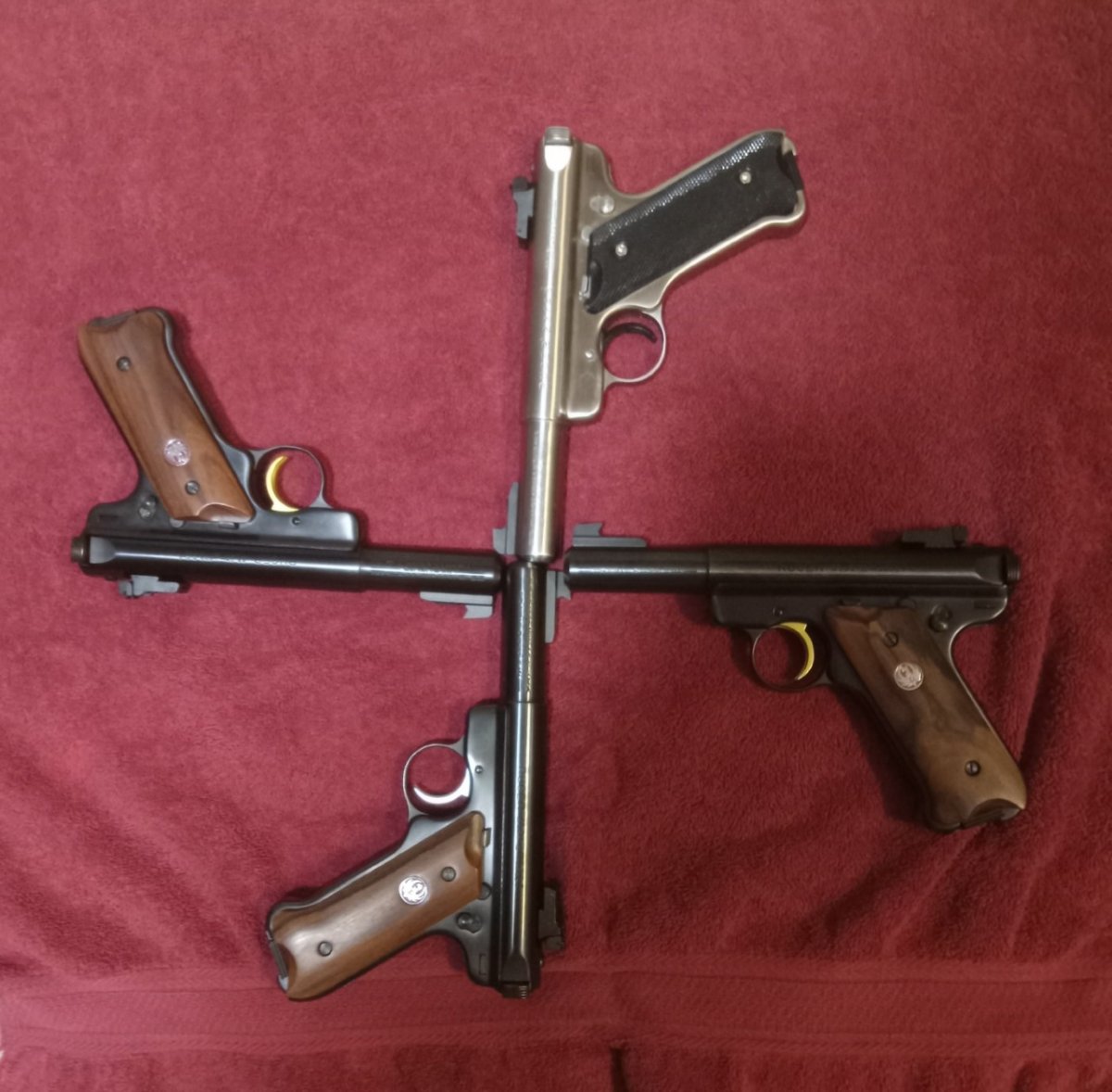A wheel arrangement of MK4B, MK4BL's and a FrankenRuger. The unintended symbol is not an endorsement of certain events of history. The MK4B and associated models are the handiest carrying pistols for field use. The RST6 was my 1st new pistol and retains a special place in my life. Sadly, as I have said before, it grew feet while I was on a voyage along with 6 other guns and 2 boxes of tools. I think the finest .22 pistols ever made were the original 1949 to 1981 vintage RST4, RST6, T514, T512, and T678 pistols and the next generation Mark 2 models from 1982 to 2005. Just my opinion as a happy Ruger owner and accumulator. Or is that collector?