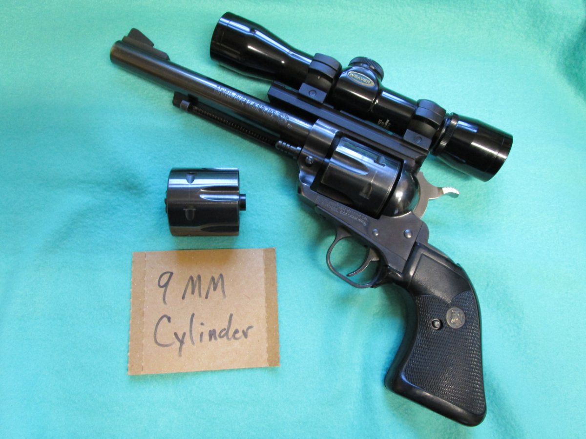 SOLD Ruger NM Blackhawk, .357 Mag, 6 1/2" barrel, Weaver 4x28 Dual X reticle long eye relief scope, w/ Power Custom free spin pawl installed and extra 9mm cylinder. Pachmayr grips (he is looking for the original grips but don't hold your breath). Original rear sight and original springs included. S/N 33-9728x (1972) Not much wear on it, cylinders and bore are very good. NO BOX - he never saved them when he bought them.