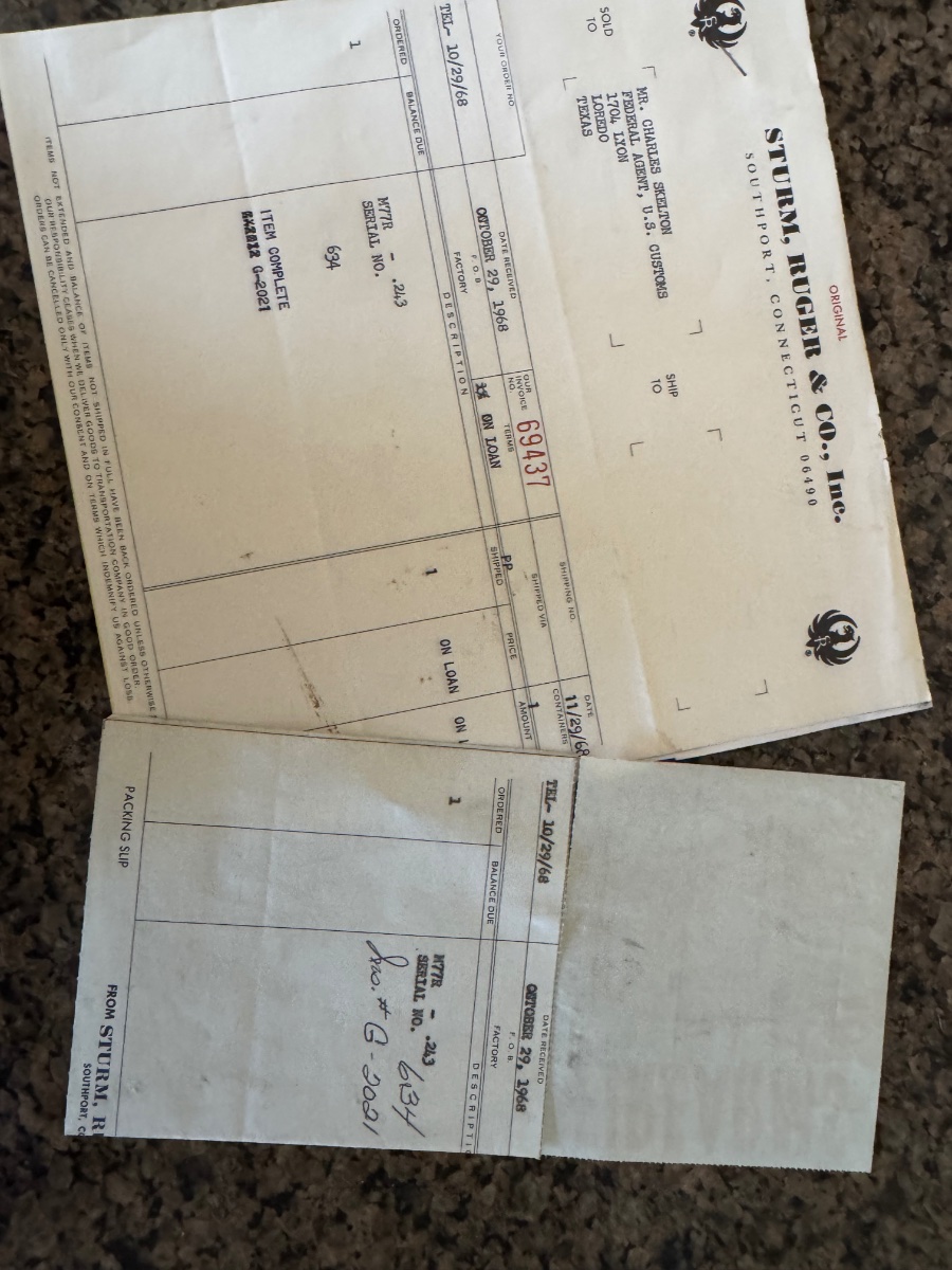 In my quest for non prefix Model 77’s I ended up with an interesting original factory invoice for a Ruger M77R Serial number 634 sent to Charles Skelton Federal Agent, US Customs, Loredo TX dated 10/29/68