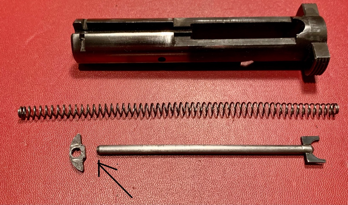 So… My theory is that my pistol number 14xxx, made in late 1951, was installed with an unstaked recoil spring rod exactly as described in the patent. Somewhere along Ruger realized that staking the recoil rod, spring and plate into one unit made things simpler. But for a time, some Red Eagles came out with the redesigned bolt but having an unstaked recoil spring rod. No?
