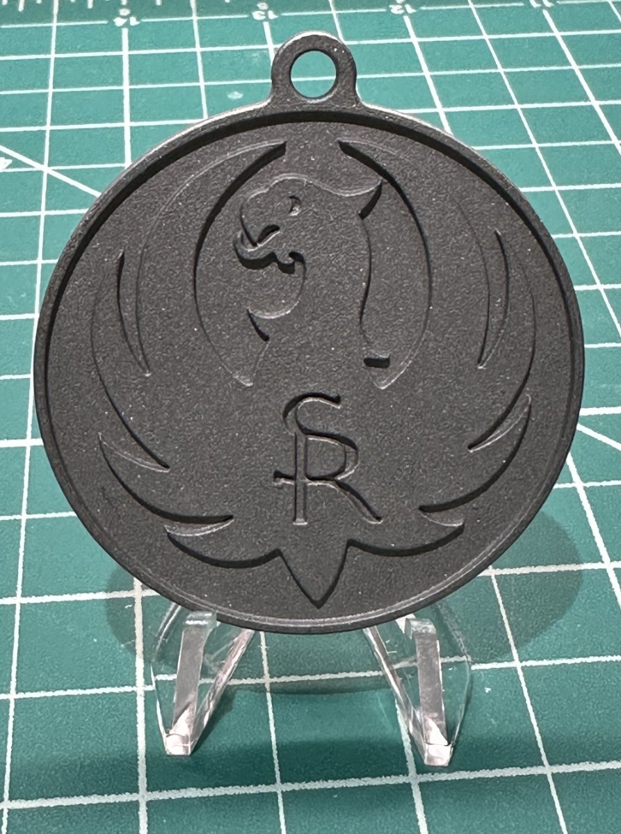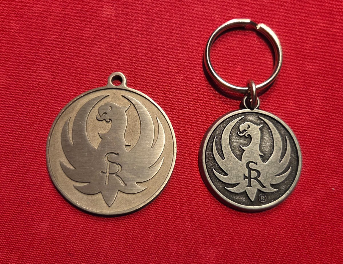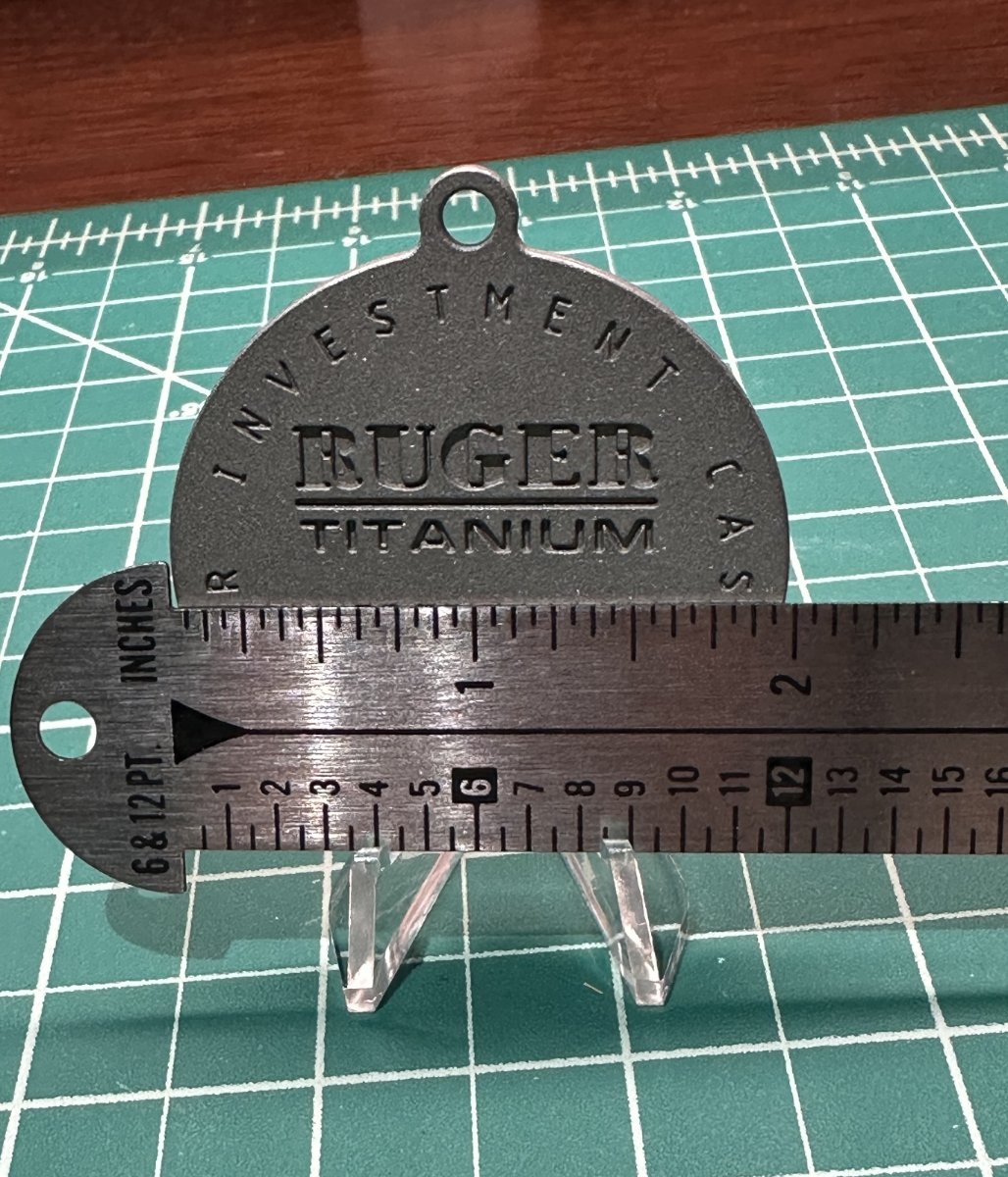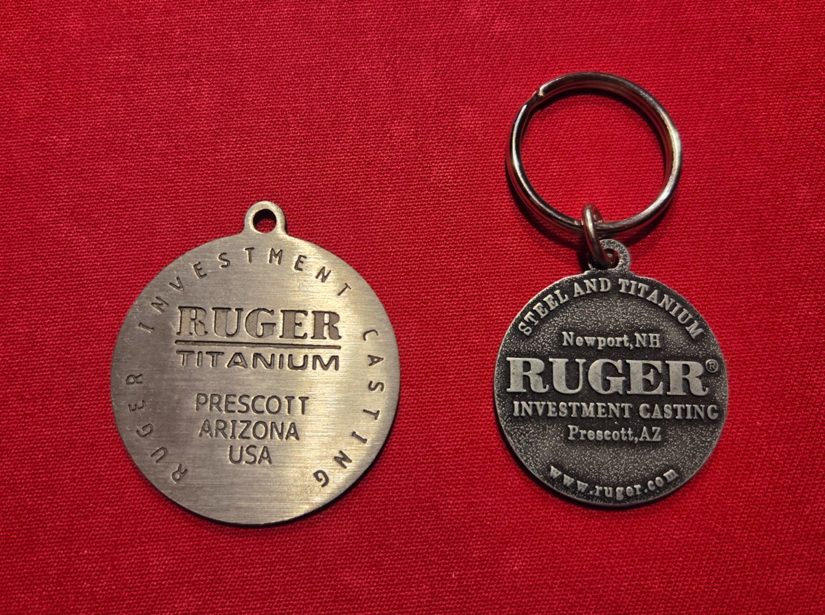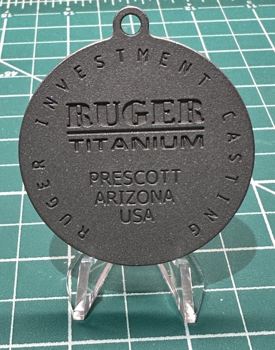 Given these when traveling in Prescott, AZ during a vendor visit to the factory, have 4 of them. They are 2” in diameter, the back side reads “ Ruger Investment Castings” – “RUGER TITANIUM” – “Prescott, Arizona USA”