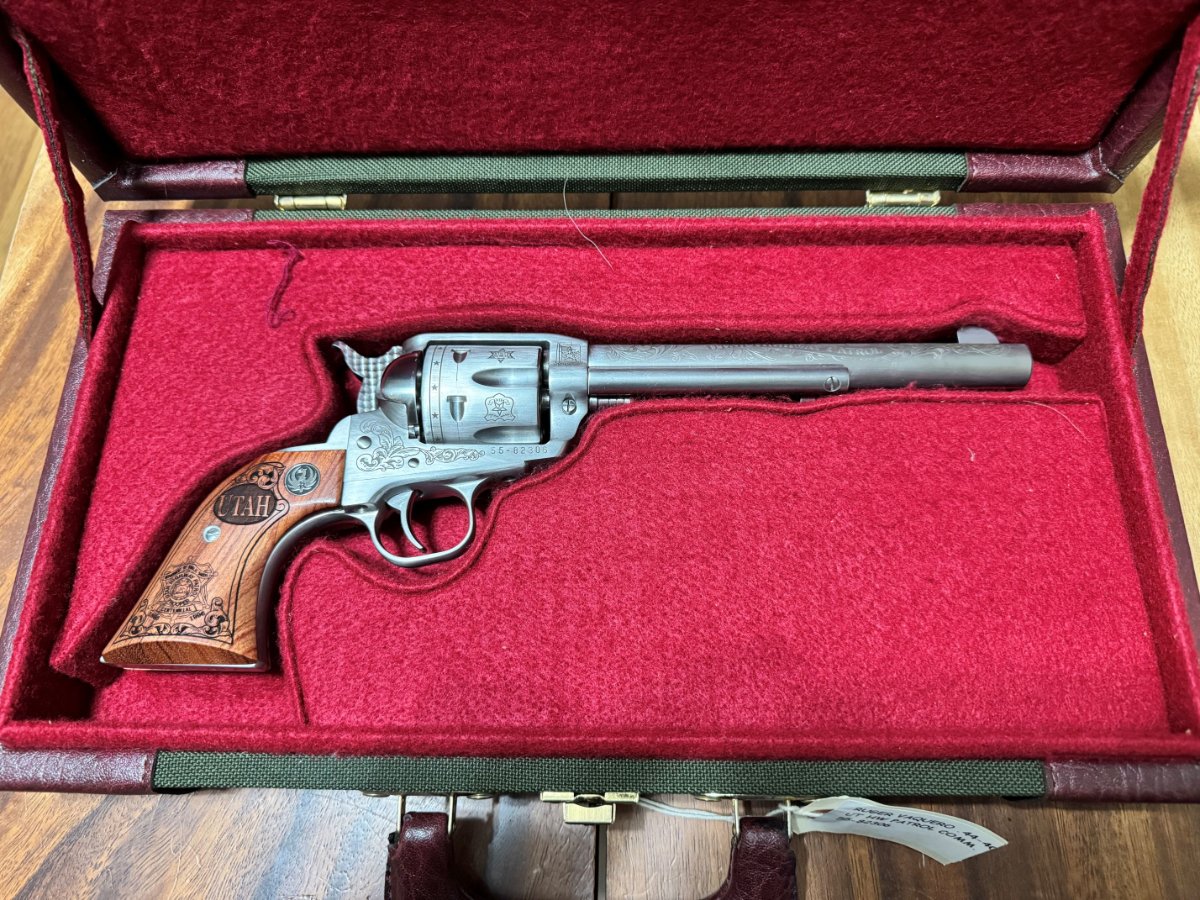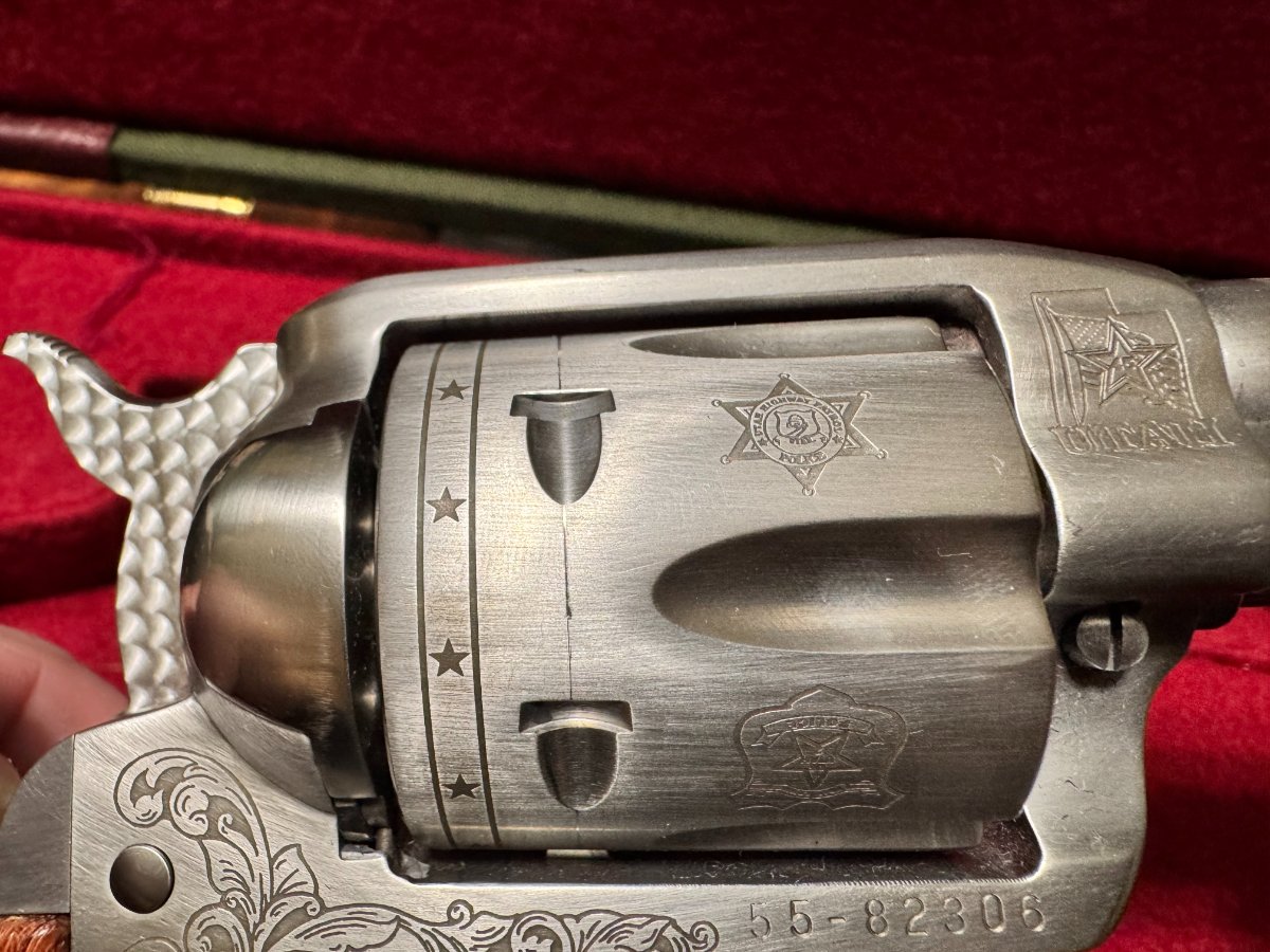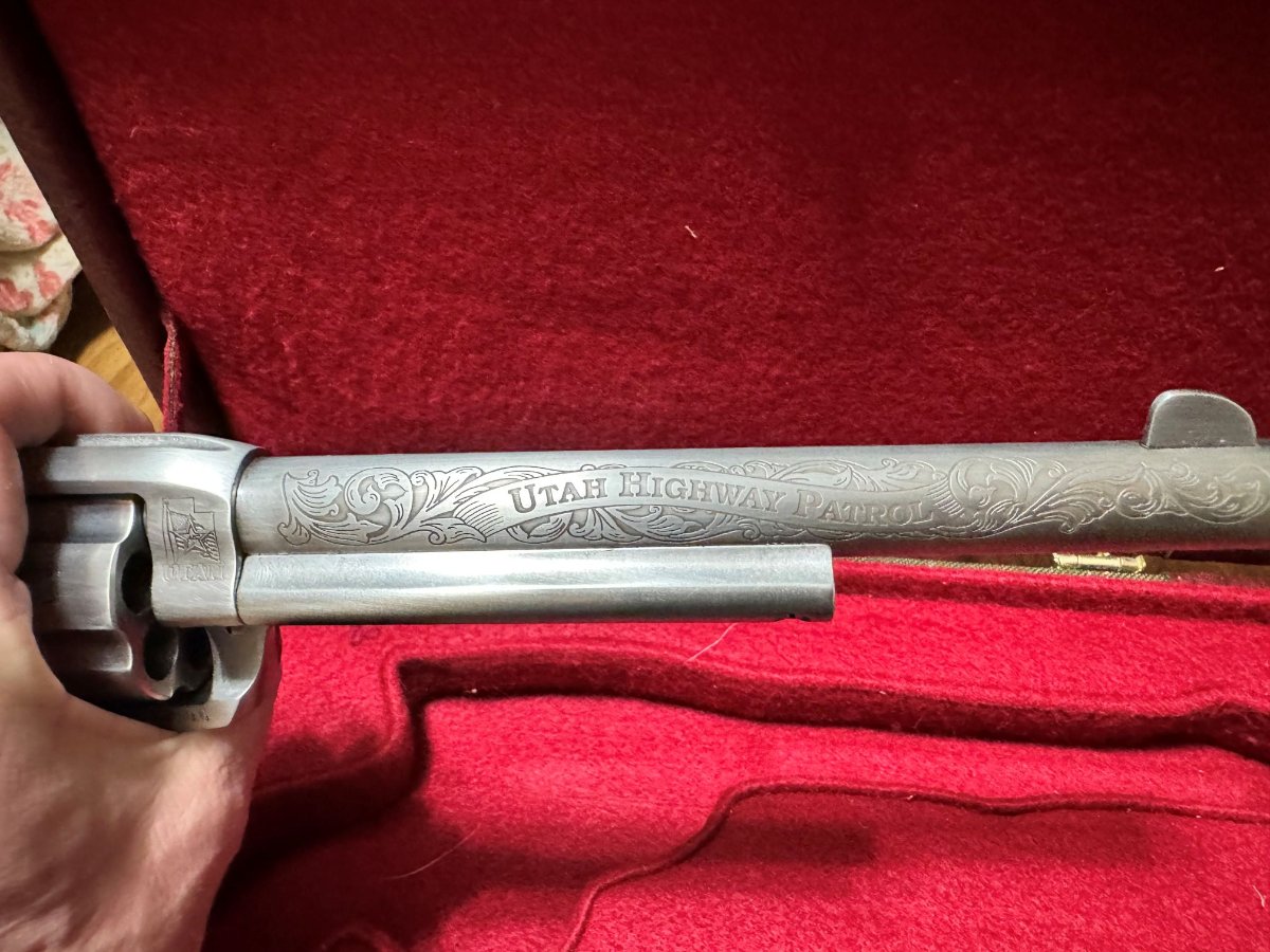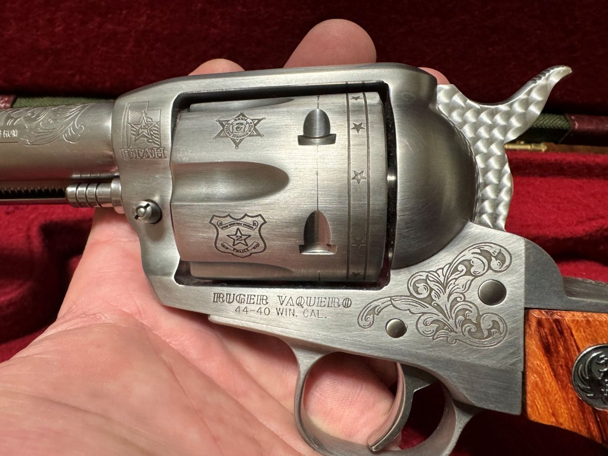 The gun is a New Model Vaquero (1995) in 44-40, with a 7 1/2" barrel, laser engraved by A&A Engraving to commemorate the 100th year anniversary of the Utah Highway Patrol. I do not yet know if it was commissioned by UHP or someone else, nor who might have received it (research is out on both). It comes in a very nice, but generic, case, but is numbered "10 of 10". The gun has been fired and does have a minor turn ring. I also realize there are two (maybe three) values, 1 for a nicely engraved new model vaquero in 44-40, and one for someone who collects both revolvers and UHP memorabilia (try to imagine both), (the 3rd is for a used vaquero in 44-40 with a 7.5" barrel)