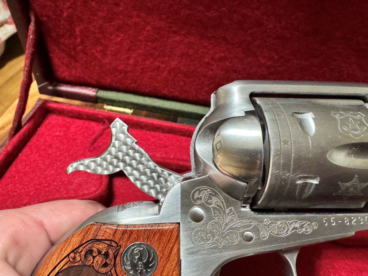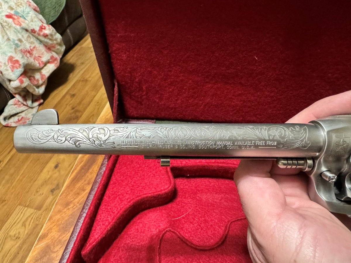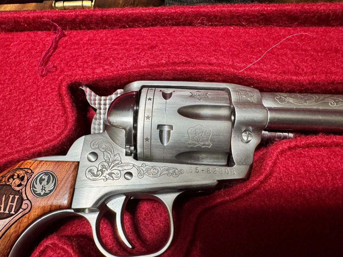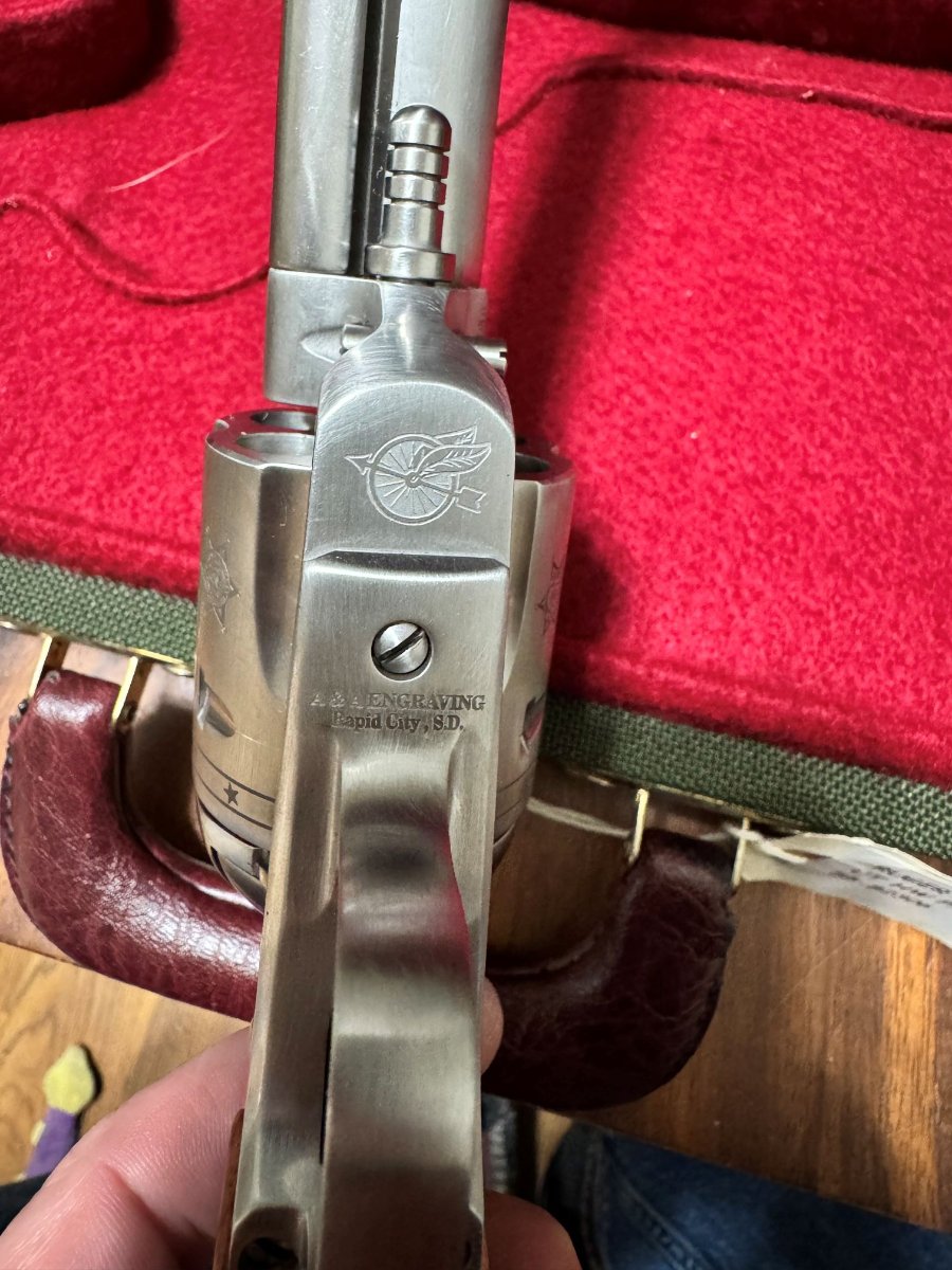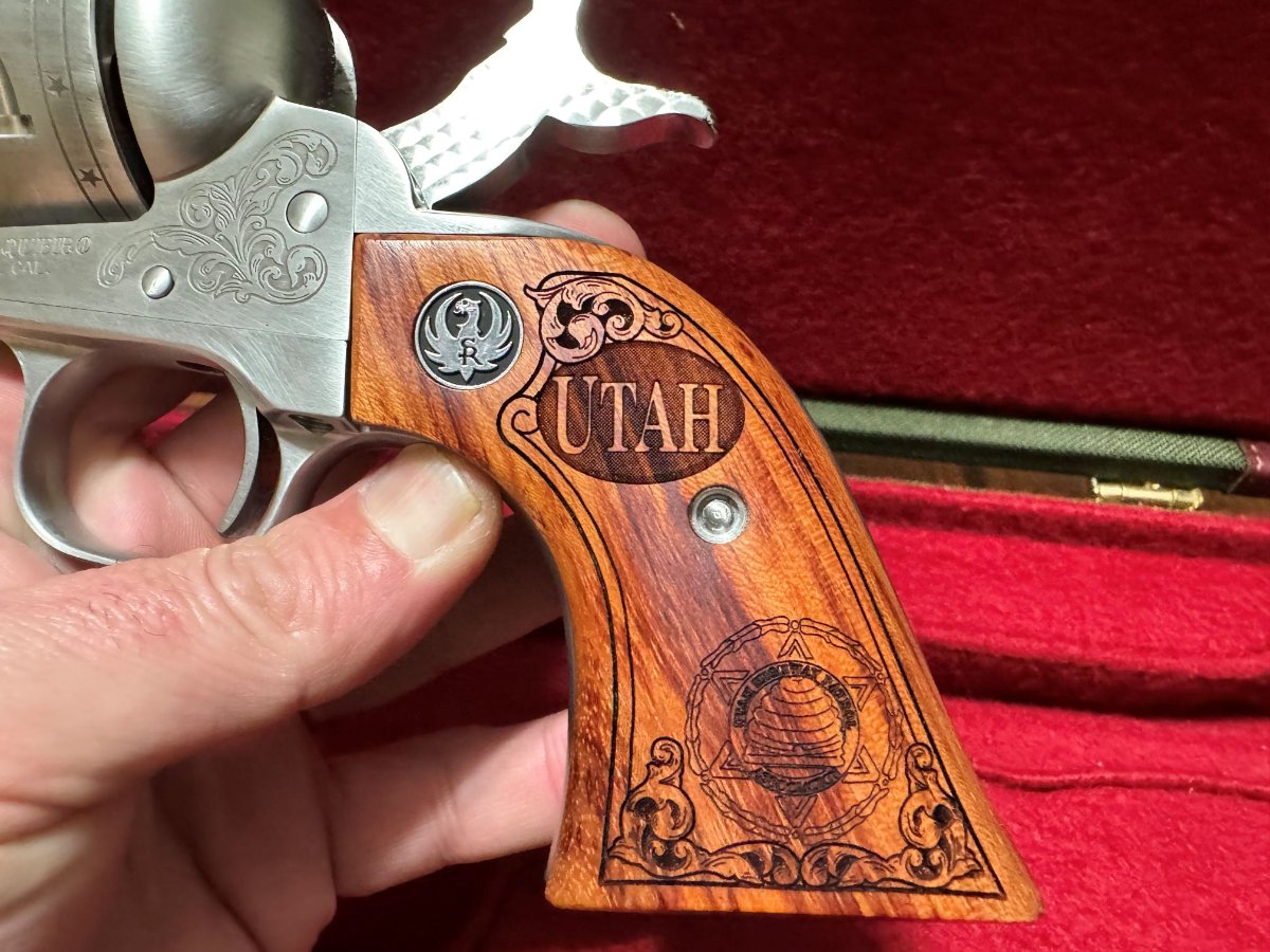 The gun is a New Model Vaquero (1995) in 44-40, with a 7 1/2" barrel, laser engraved by A&A Engraving to commemorate the 100th year anniversary of the Utah Highway Patrol. I do not yet know if it was commissioned by UHP or someone else, nor who might have received it (research is out on both). It comes in a very nice, but generic, case, but is numbered "10 of 10". The gun has been fired and does have a minor turn ring. I also realize there are two (maybe three) values, 1 for a nicely engraved new model vaquero in 44-40, and one for someone who collects both revolvers and UHP memorabilia (try to imagine both), (the 3rd is for a used vaquero in 44-40 with a 7.5" barrel)