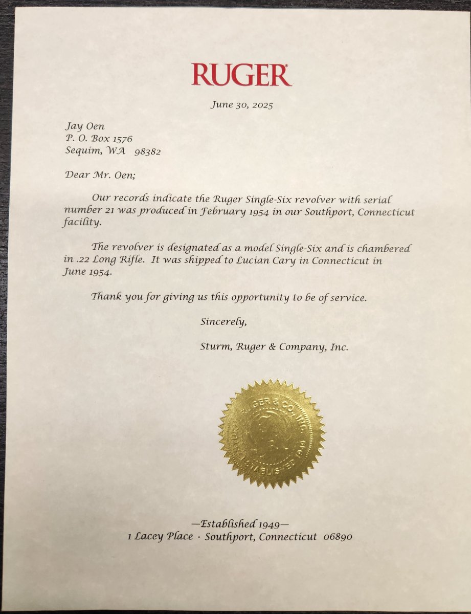 I just got the Ruger letters today on these two.chet15 wrote: ↑Tue Apr 15, 2025 1:40 pmYes, Taylor had that number later. But writer Lucian Cary got that Single-Six originally.