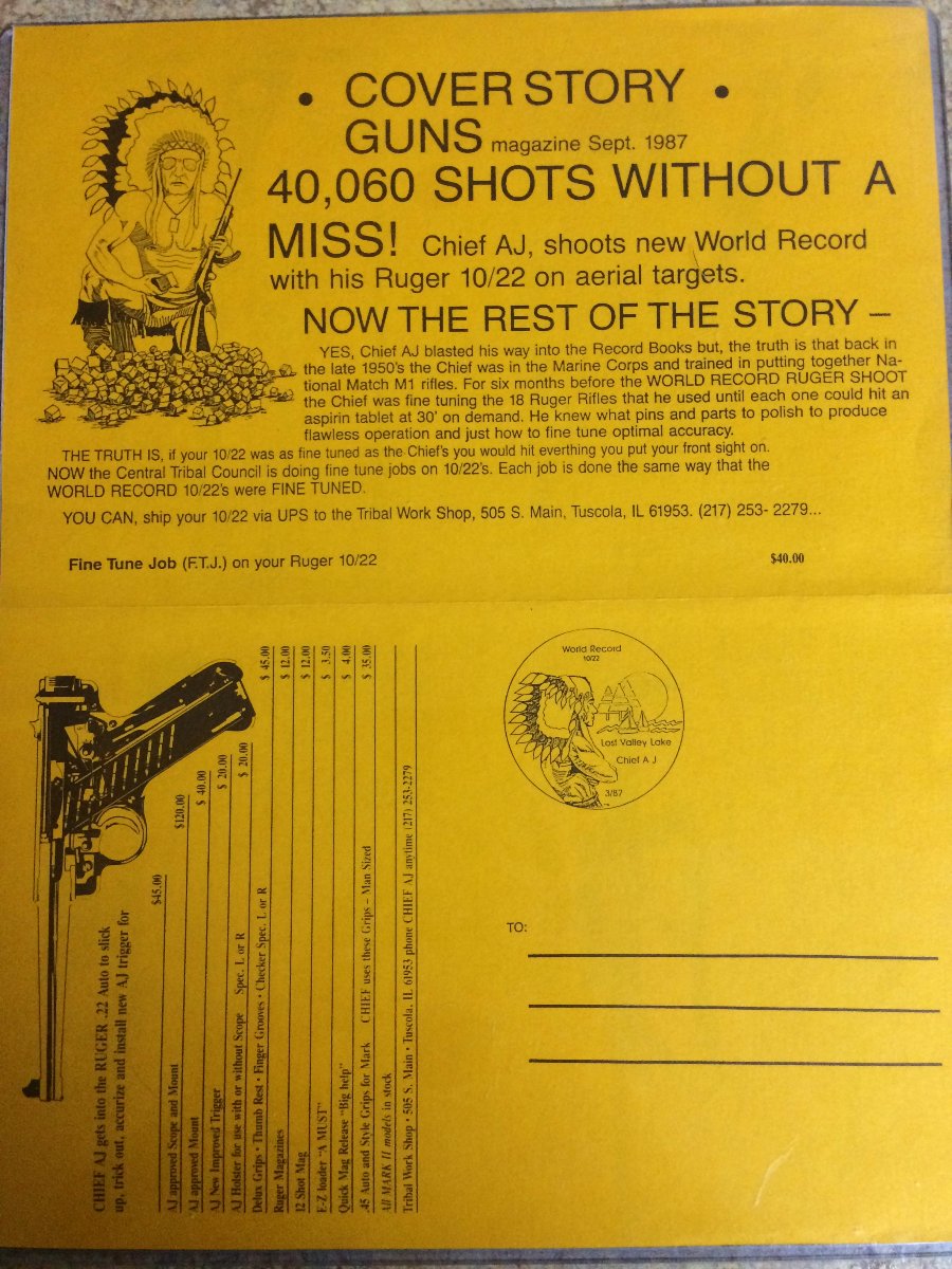 Hi, I came across this older post about Chief AJ. I bought a 10/22 that he built. It is one of the straight stocks that has his image and name laser engraved. Do any of you know much about it? I had AJ send a letter of authentication, he said these are very rare, only 12 or so were sold before Ruger bought the stock design
