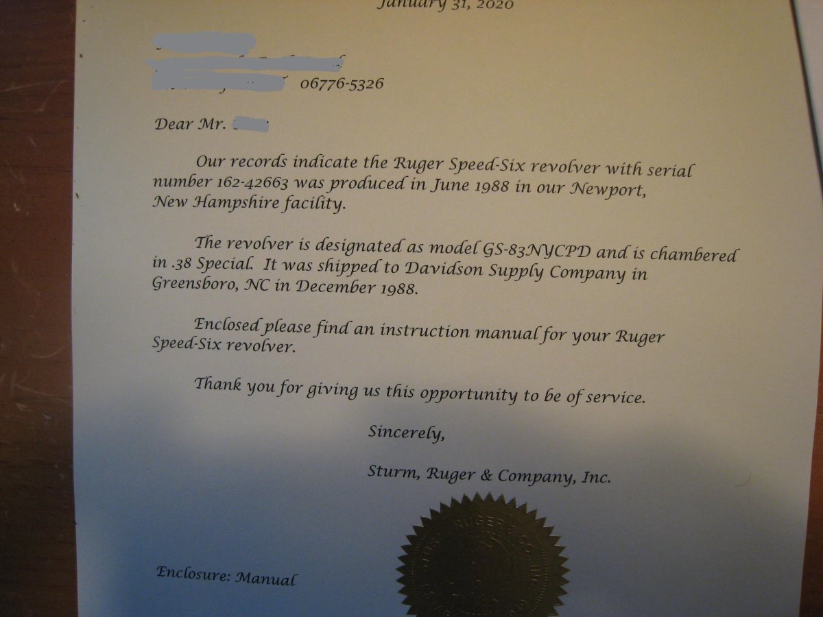 Thanks Ron, I'm pretty excited to own it. Here's the letter designating it GS-83. I know ALL the GS-83 were 38 spl(8) and 3"(3) thus 83. I do also, like you, wonder if since the USPS guns preceded the GS-83 and my gun was produced 6 months before(June 1988) the end of the run(sometime in 1988) whether they may have used frames and/or barrels left from the USPS guns. But the USPS were 357s and the GS-83 38s so the cylinders and the caliber markings on barrel would be different. I checked whether my cylinder chambers would accept 357 and they would not. I did take it to the range yesterday and was amazed at how much better my groups were vs my SP101 2.25". Great gun.