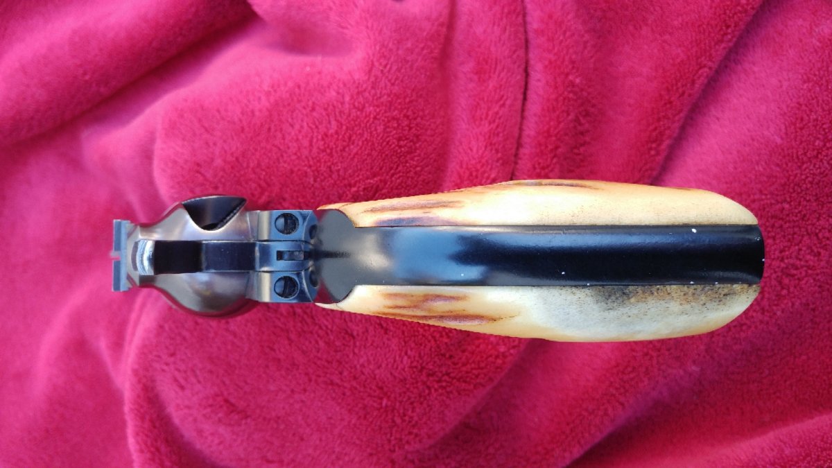 Mine needed a little cleaning (lots of lead fouling around the forcing cone) and it has a couple nicks I hadn't noticed but it's in pretty nice shape. A set of stags bring a little more color to the party and really compliment the gun. The keen-eyed will notice that they are factory knock-offs but I love their unique look. Here are some new photos.