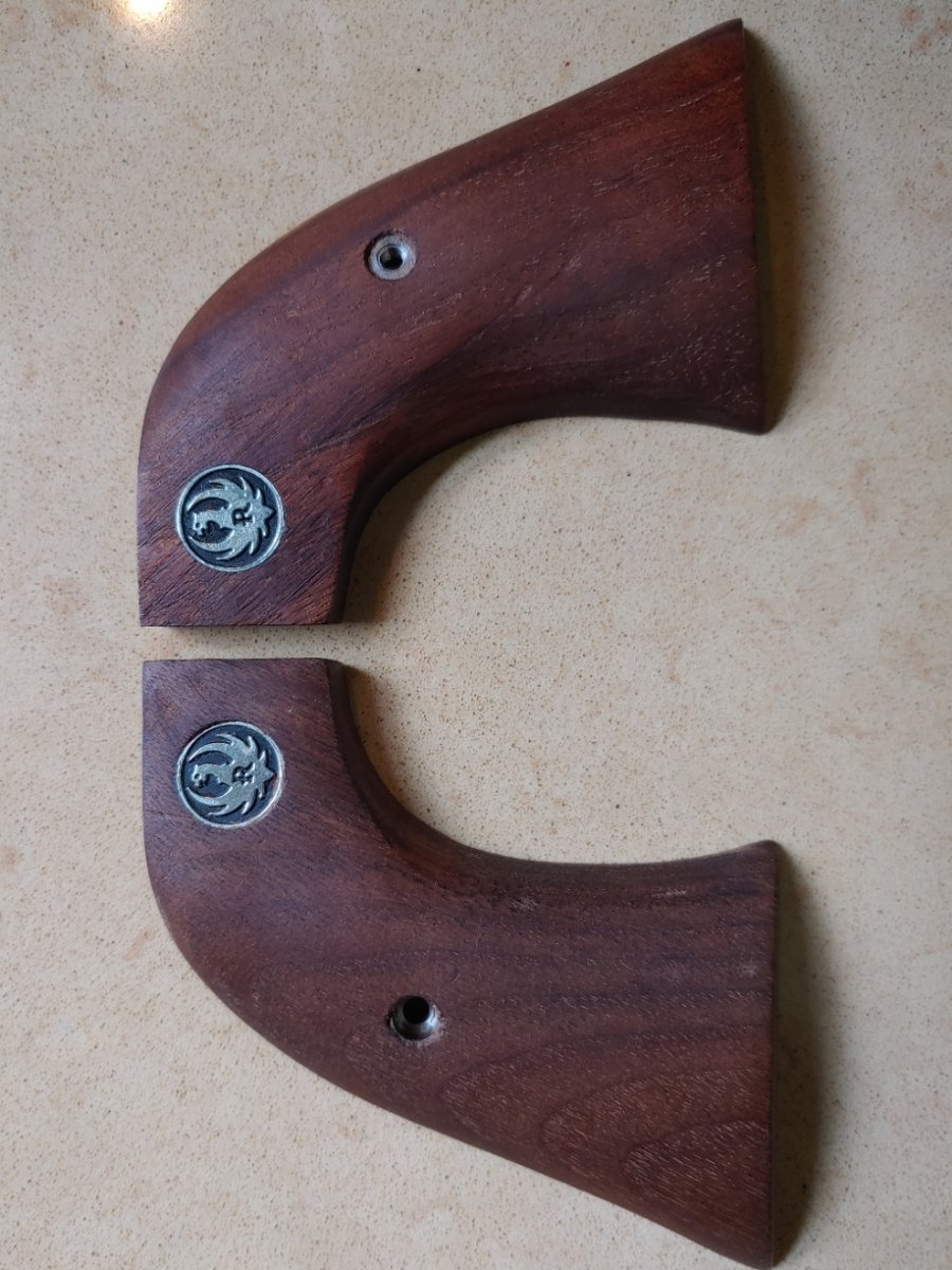 Since the gun has been fired a bit, I decided to bring the grips up to a level befitting it's limited status. I also couldn't abide those sharp edges. So, I knocked down some high spots, beveled those edges, did some fine sanding and rubbed-in some linseed oil. I wanted to retain some grain texture to honor the concept but bring out some light play in the grain. They do fill the hand, look nice and, in the finest Ruger tradition, don't match.