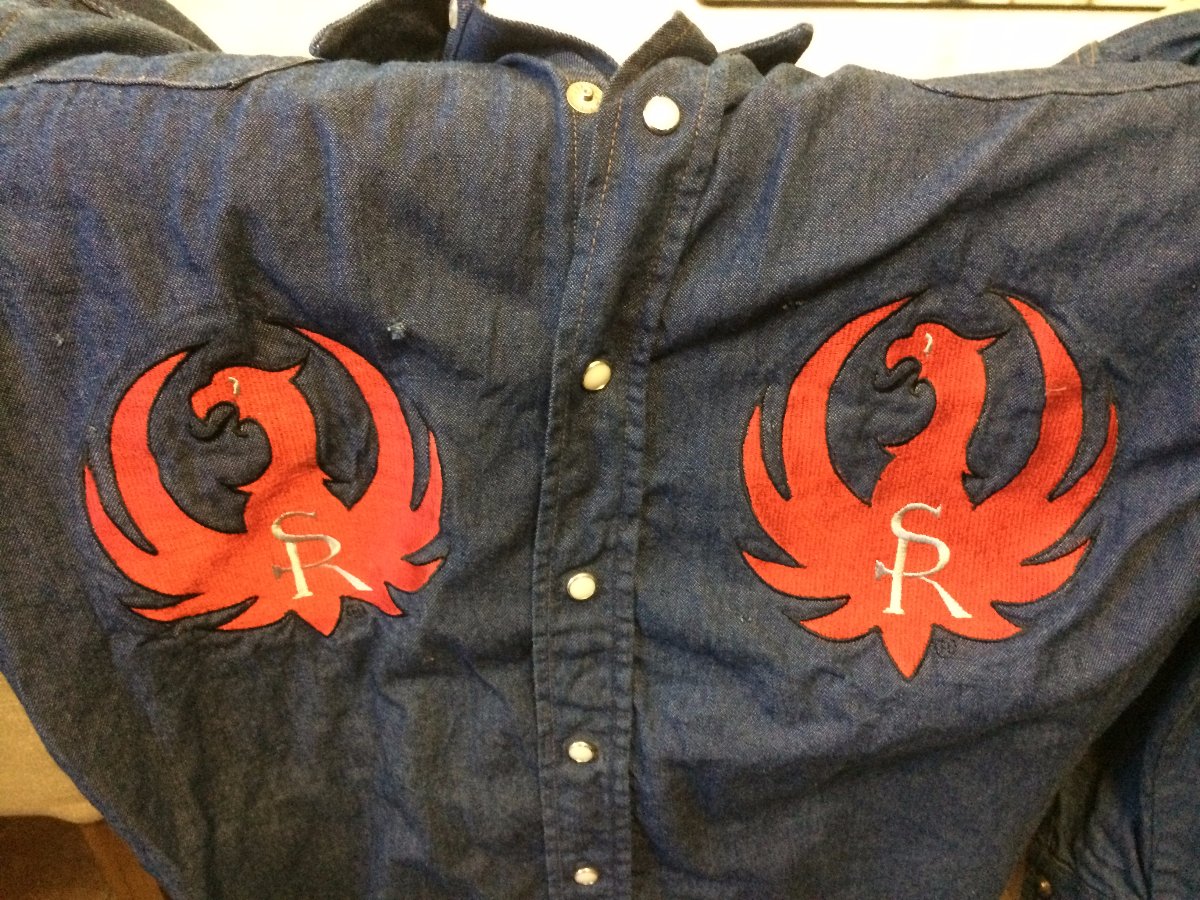 Black Levis dress pants with Ruger bird on each leg. Wrangler Denim Shirt with red Eagles. Not Factory Items.