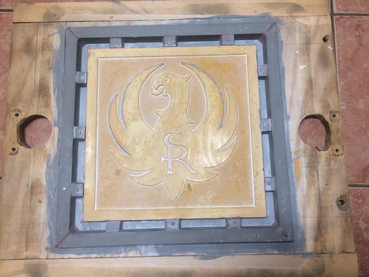 This is where I need someone more familiar with their operations to help me fill in the details. From what I understand they take these wax molds and coat them in something which allows them to bake it. The outcome of that would be another mold that molten metal would be poured into. Once this hardens you would have a large correct metal Ruger emblem. I'm interested in anything that anyone can tell me about it. What a former employee of theirs told me was that he thought it was a metal mold itself but there is no way this wooden thing could take molten metal. I find evidence of chalk and wax only. Anyway, enjoy.