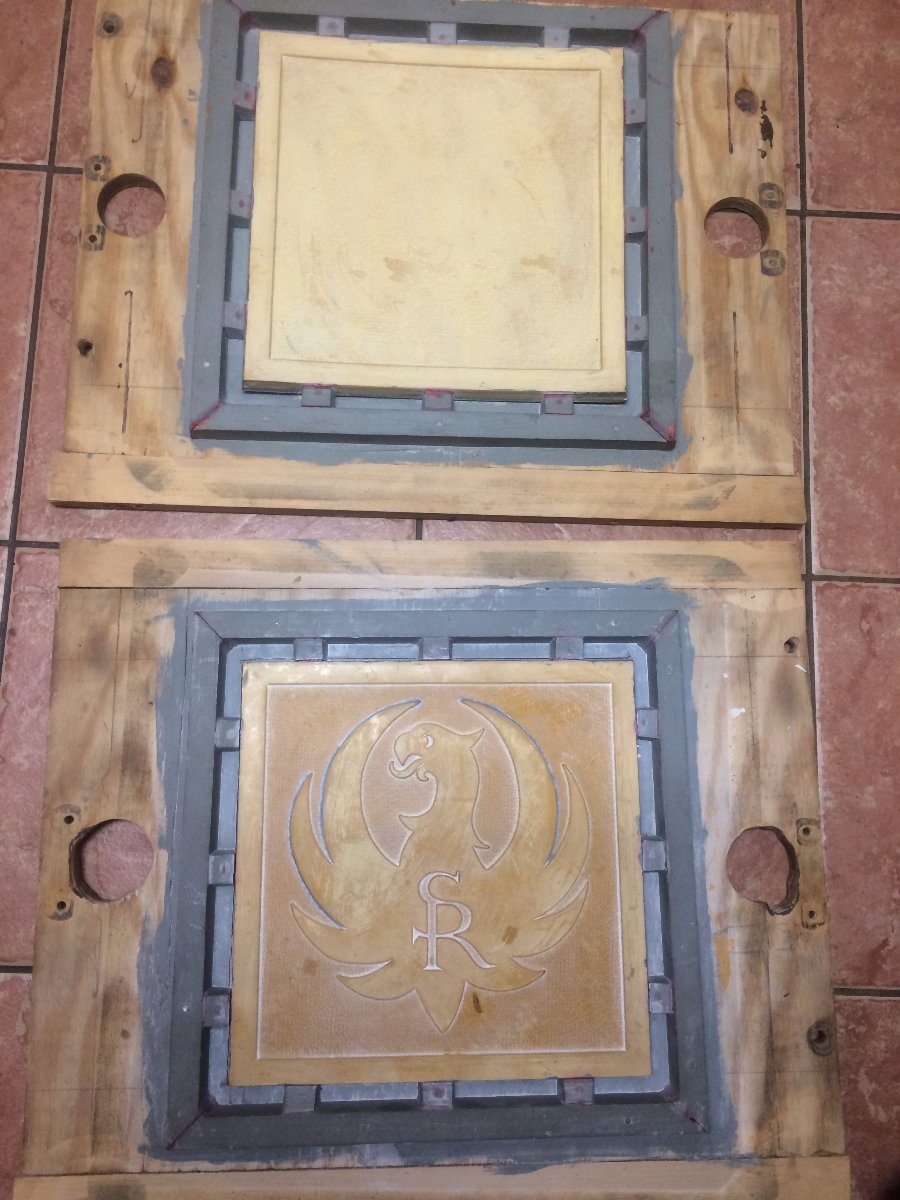 So this is also something which I found extremely interesting. It came from Pine Tree Castings, is well built and heavier than it looks. What I have determined is that is a mold ultimately used to make a large Ruger bird. I have determined that chalk was used to line the entire inside of the mold on both pieces. Then, a maroon colored wax was poured into the inside of either part A or B. Parts A and B are labeled on the back of each. A has the eagle and B is a flat square. Once wax was poured the mold was bolted together on each side until dry. The small trays on the side of each mold would have caught the excess wax as you pressed the mold together. Then, what comes out is a large square of wax with the eagle pressed into it but when you look at it, it would be a reverse.