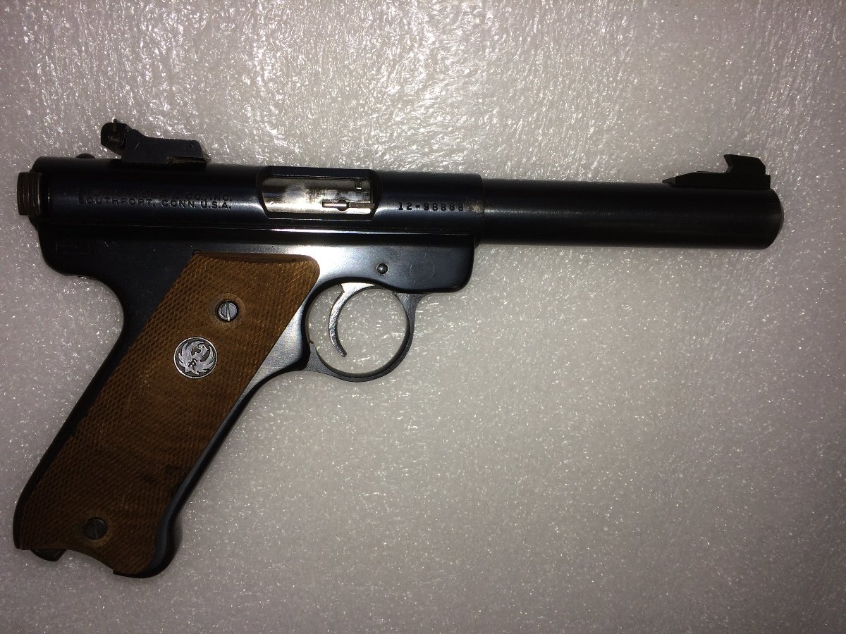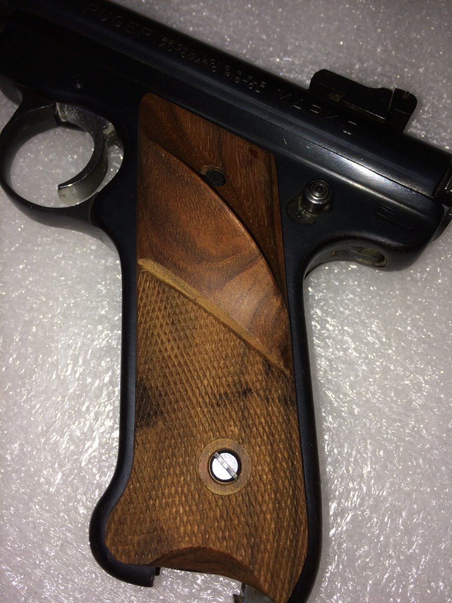 When I received this 1975 T-512W Mark I, it was a sad sight. The grips didn't match and the right panel wasn't factory and missing a screw. It desperately needed a deep cleaning and some TLC as the action had a slightly gritty feel to it. Thanks to Don F. I was able to round up a beautiful set of factory Walnuts w/ thumb rest and a new set of screws. I love the dark band that runs around them at the palm. Thank you, Don! Here she is in the rough.
