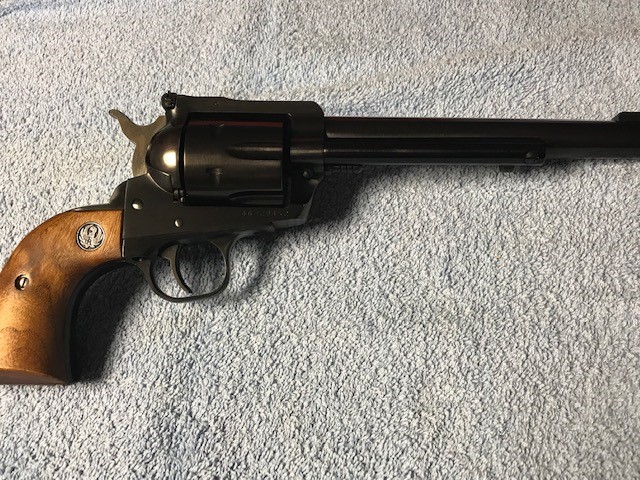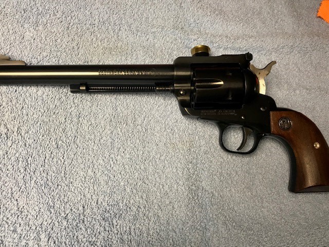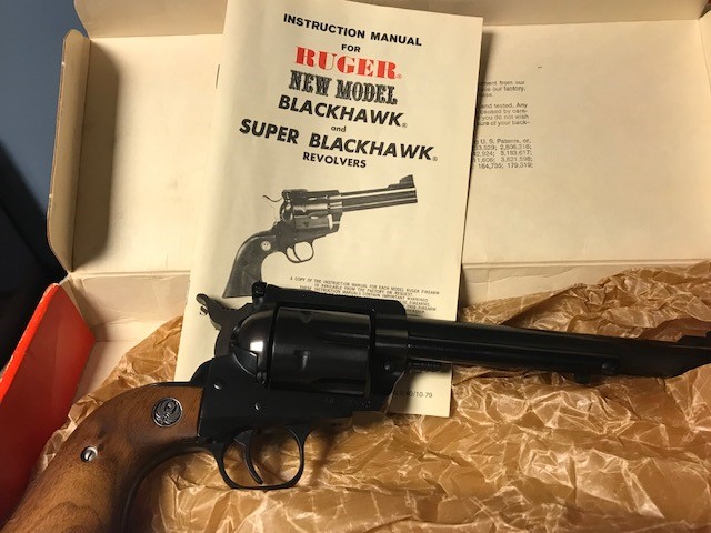 Outstanding original condition! A Ruger New Model BN-45, .45LC revolver that was manufactured in 1976 and specially rollmarked "Made in the 200th Year of American Liberty" along the top of the barrel. The left side of the barrel has the simple Ruger address rollmarking, no "warning". A large single-action revolver, this Ruger chambers the .45LC and wears a 7-1/2" barrel with adjustable rear sight. This revolver is in outstanding original condition and I would surmise only test fired. The cylinder is properly numbered to the frame with numbers etched on the front face. The original blue finish rates 99% with nearly no hint of a cylinder line. The balance of the gun is nearly flawless. There is no rust or pitting. The original walnut grips are excellent, free of cracks, chips, dings or wear. The mechanics are in perfect working order and the bore is excellent! This handsome revolver comes in an original red cardboard box which unfortunately doesn't number to the gun. The box has great color and sticker but has some writing on the top. Also included is the 1976 dated owner's manual. A very nice revolver for a NM/Liberty Ruger collector, this one would be hard to upgrade.