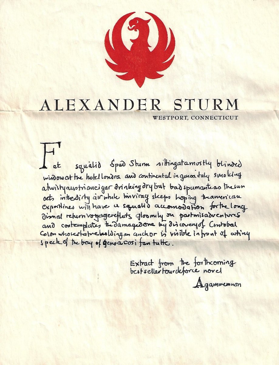 After comparing these handwritings against the signed and personalized From Ambush to ZigZag I do believe that your assumptions about it being authentic are correct. His style and use of the pen are quite unique then and now. Letters like these would be instrumental to handwriting analysts when verifying the authenticity of other Alex Sturm documents that are surely out there.