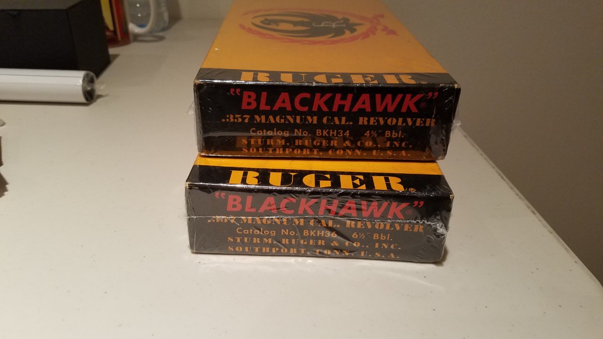 I am finishing up my article on .357 Blackhawks for the May RENE (protected sight models) and don't remember if all the boxes for the Old Model BKH-34X / BKH-36X convertibles had a white label covering the end saying BKH-34X or BKH-36X. Can somebody help with that? If I remember correctly, most boxes did not have a BKH-34X or BKH-36X label on the end for the convertible models, and such a label may only have been used if for some reason Ruger ran out of stock at any given time of any BKH-34 or BKH-36 printed box.