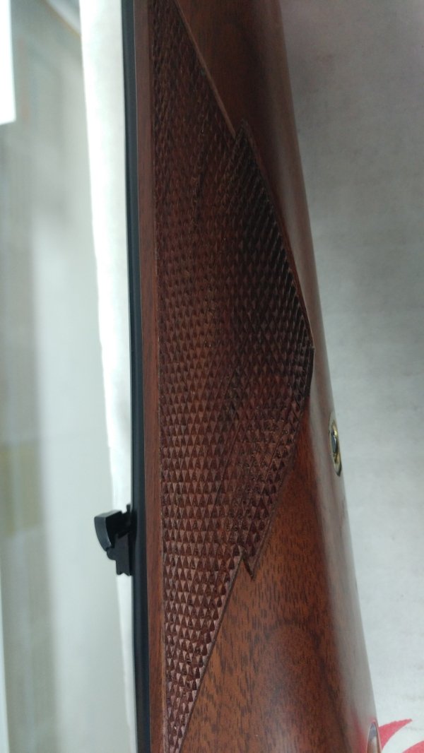I think it would be more properly called a Deluxe Sporter concept. I wonder if they started with a standard stock and hand-carve this beauty? The work on the grip is unique - everything is more slim and sophisticated with a sporting comb. The butt is a stippled black recoil pad with a black spacer. It feels just amazing in-hand. Due to our ten-day wait and my FFL's honeymoon closure I won't have it in-hand again until May 31. Bummer!