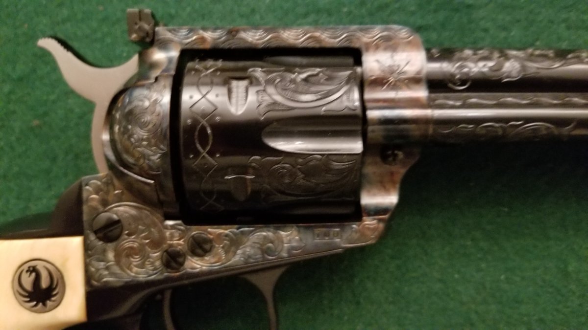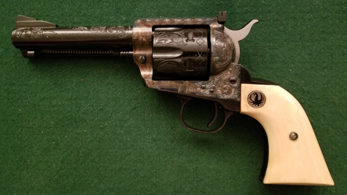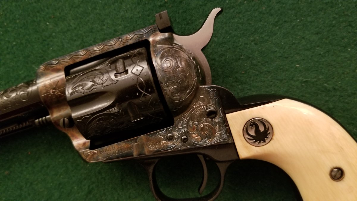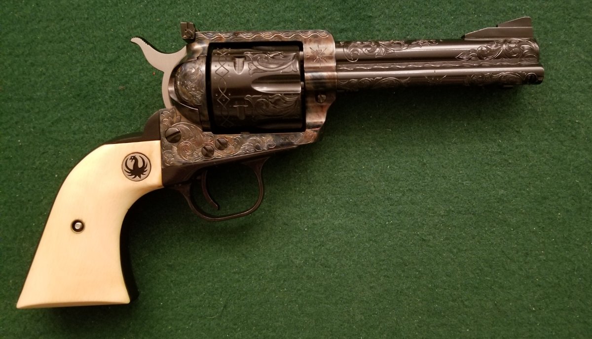 Recently received this one back from Bobby Tyler at Tyler Gun Works. It is a early .357 Blackhaw, serial number 700. The case hardening and hand engraving are excellent!! Thought that I would share a few photos with it wearing some original Ruger ivories. Left click your mouse to get a closer look at the pics.