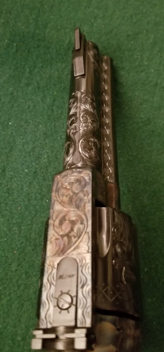 Bill, between the engraving and the color case, this gun has much eye appeal. The factory original ivories enhance the entire look!