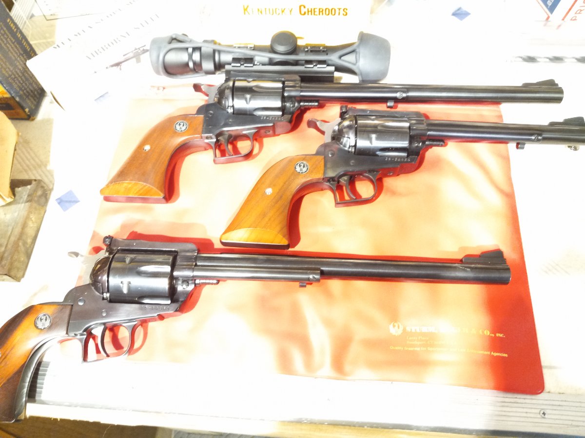 These are 3 of the "Original" Maximum prototypes. Standard .357 Mag Blackhawks with the barrel protrusion into the fame milled down so that the new cylinder is +.200 The barrel/cylinder gap is now literally a cylinder/frame gap. When Ruger started toying with the idea of the Maximum round they started with a 1.490 case length, testing it in these prototypes. According to David when Ruger realized the potential of the round they settled on the 1.605 case length. All of these prototypes I've seen, yes there may be as many as 6 more out there, are all fitted with Super grip frames and either a standard 6 1/2" barrel or a 10 1/2" barrel. Just as a side note, Bill Jr. was the one who came up with the name "Maximum"