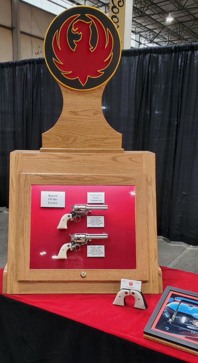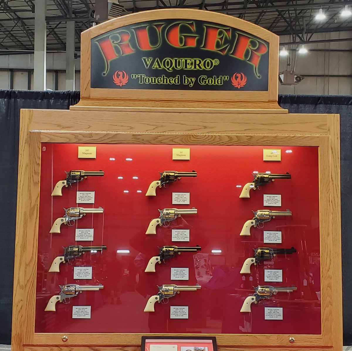Troy and Taryn displayed a collection of various options for the Ruger Single-Six with the early XR3 grip frames, 1953-1962. The center pieces of the display are the Charles Jerrett engraved all blue and polished grip frame variations of the factory engraved Single Six (RSSE). There are also many different configurations of the flatgates, convertibles, and the light weight Single Sixes attached to the back board.