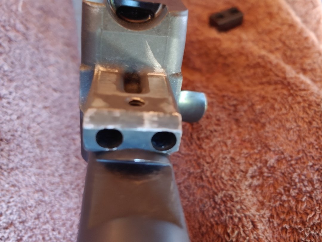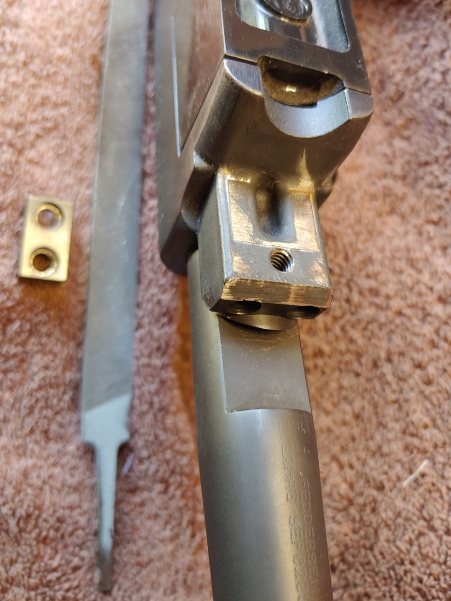 As I was fitting the receiver to the factory Sporter stock I discovered some weird stuff. The receiver would lift and unseat at the rear when tightened down. Checking revealed some casting irregularities in the bottom surface of the lug around the stock screw hole that prevented it from sitting flush with the stock. I decided to file the lug smooth instead of modifying the stock (see pics). In the process, I noticed that the v-block bolt holes in the receiver are not centered and the v-block holes are slightly off, too. Still sorta works but not ideal.