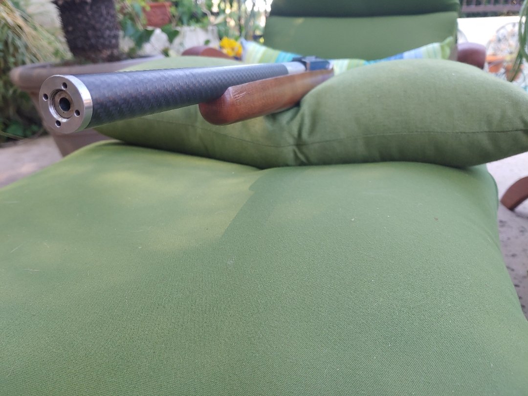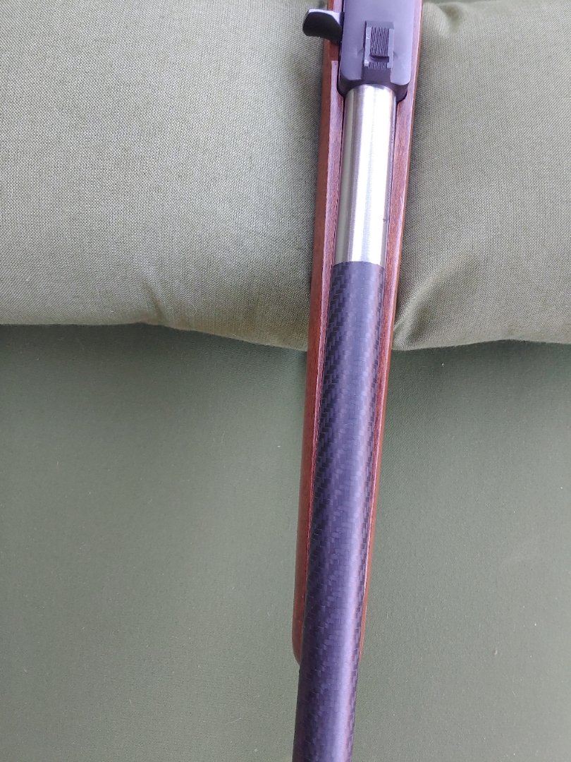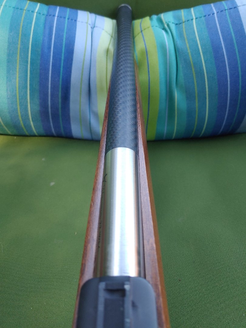 I finally acquired a donor rifle with less of a collectability factor that I was comfortable with doing a re-barrel on. It was customized with a Volquartsen carbon fiber barrel in a Hogue stock. The barrel was tight in the receiver but the bolt-bang method and some taps with a rubber mallet got It out.
