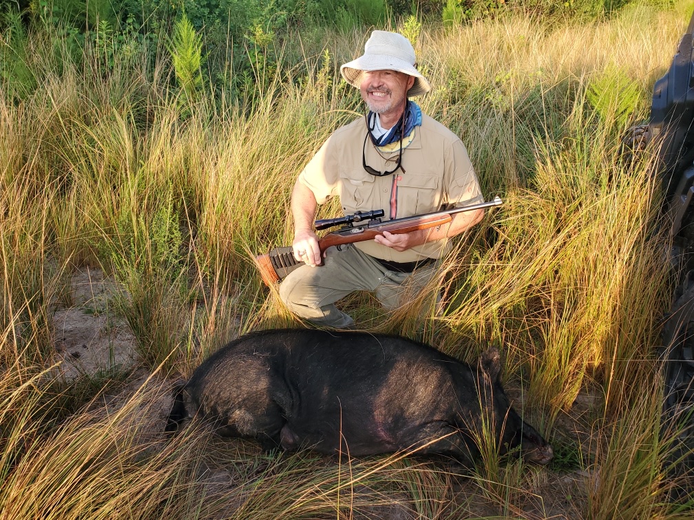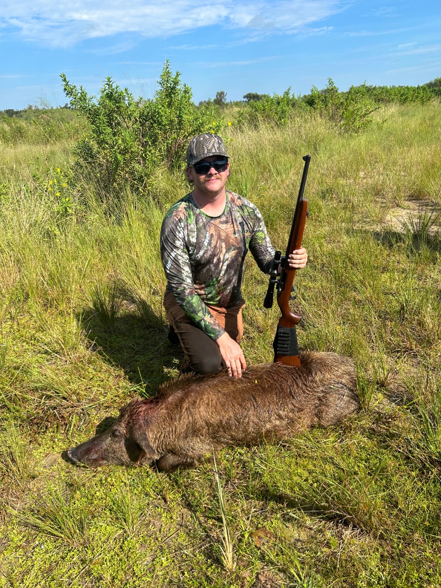 My best friend and his son in law flew down to FL to fish and hunt with me. We took my early 44 finger grove carbine out for a walk and landed 3 nice hogs. Enjoy