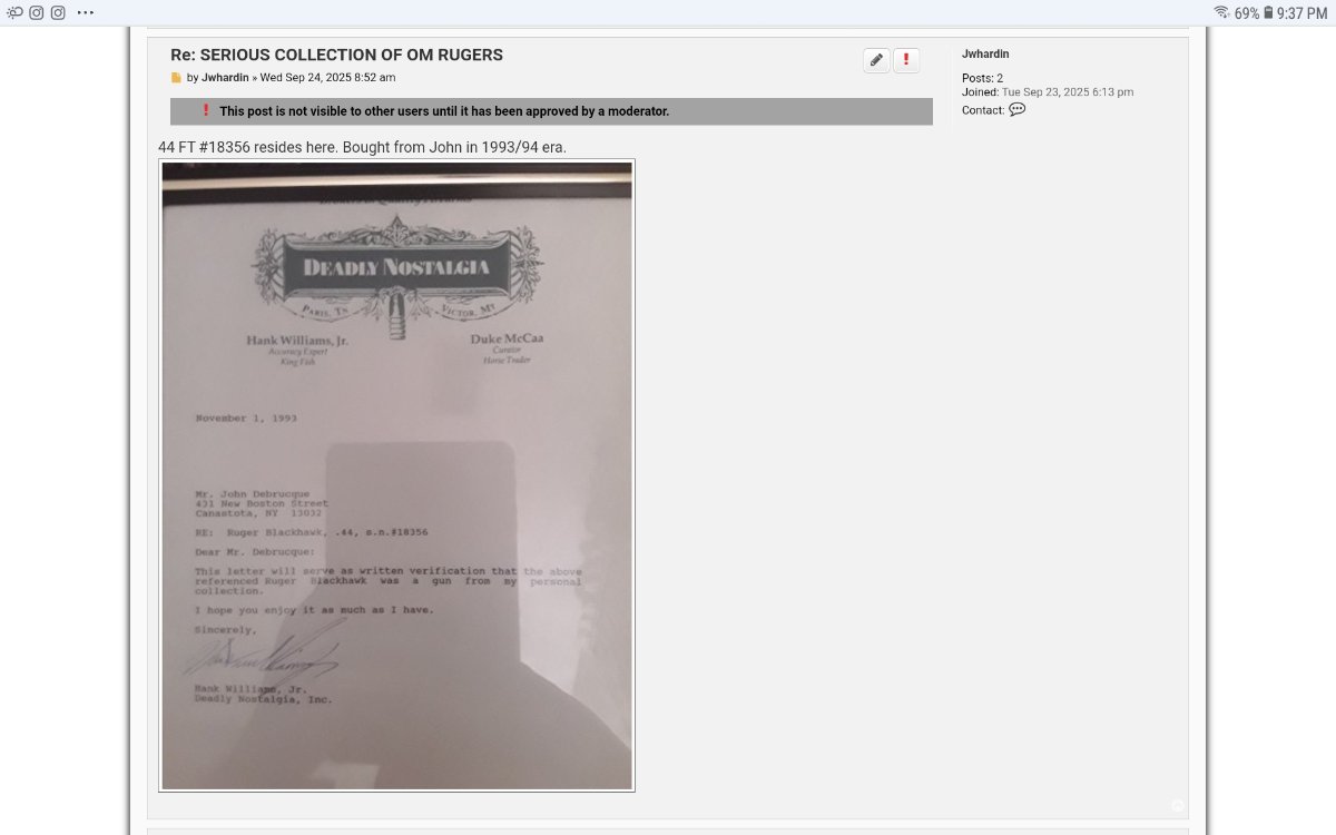 Thank you FT44, been struggling to get a post approved for few days now. Its nothing for sale or controversial, related to history of John D. Any assistance you could offer to help share history of ruger collecting would be much appreciated. Pic attached of post that has not been allowed.