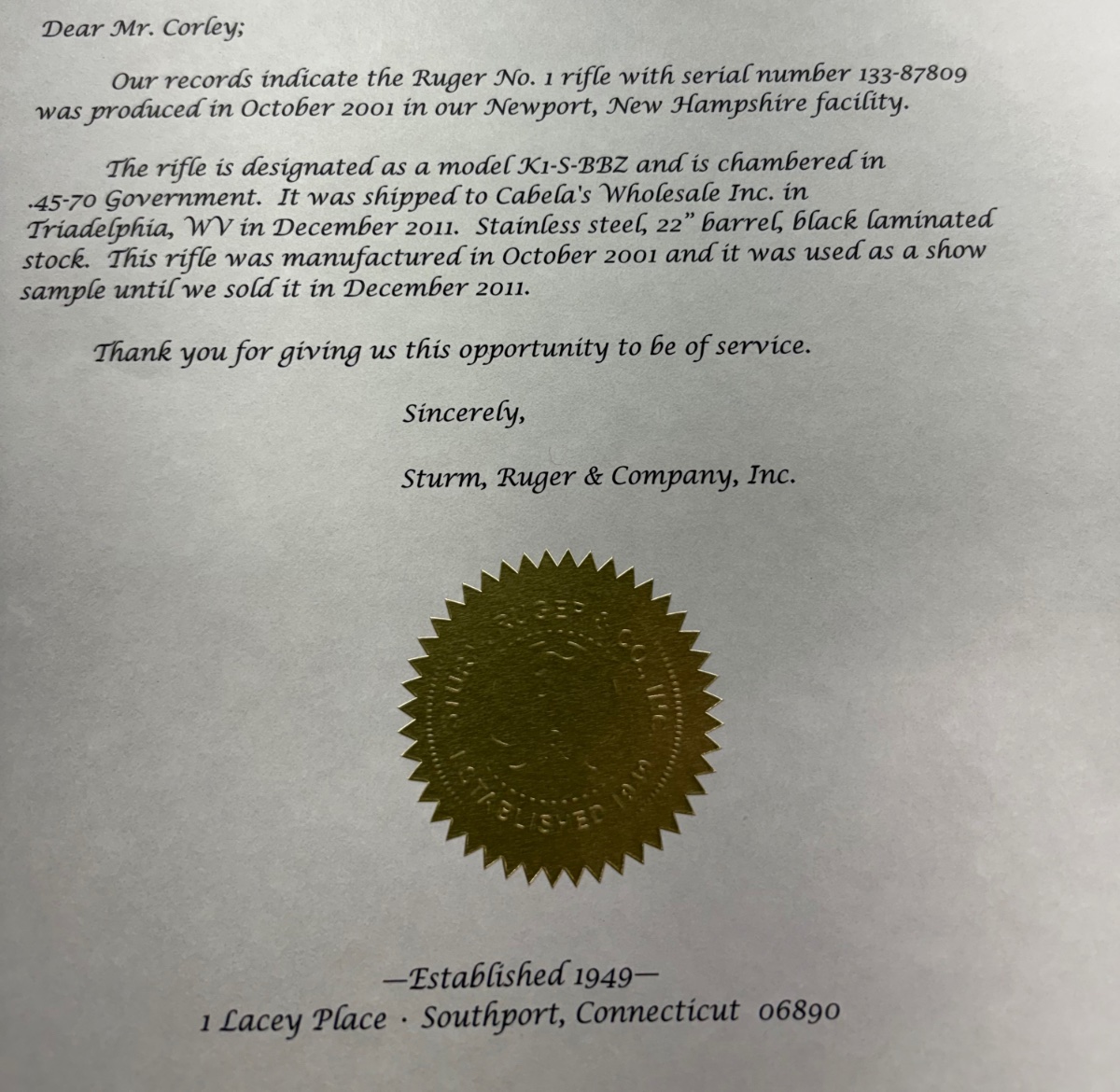 Kinda Cool Ruger Letter on a No. 1