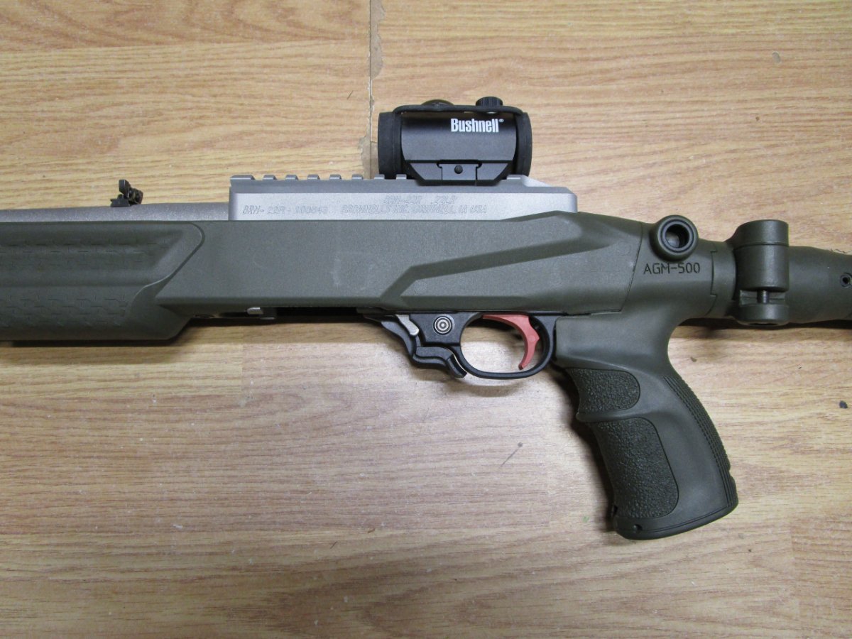 Made with a Brownells BRN-22 receiver, Ruger bolt, Ruger trigger, Ruger 18 1/2" stainless barrel (matte finish), Extended magazine release, FAB Defense folding stock Bushnell Red Dot, new Ruger magazine.