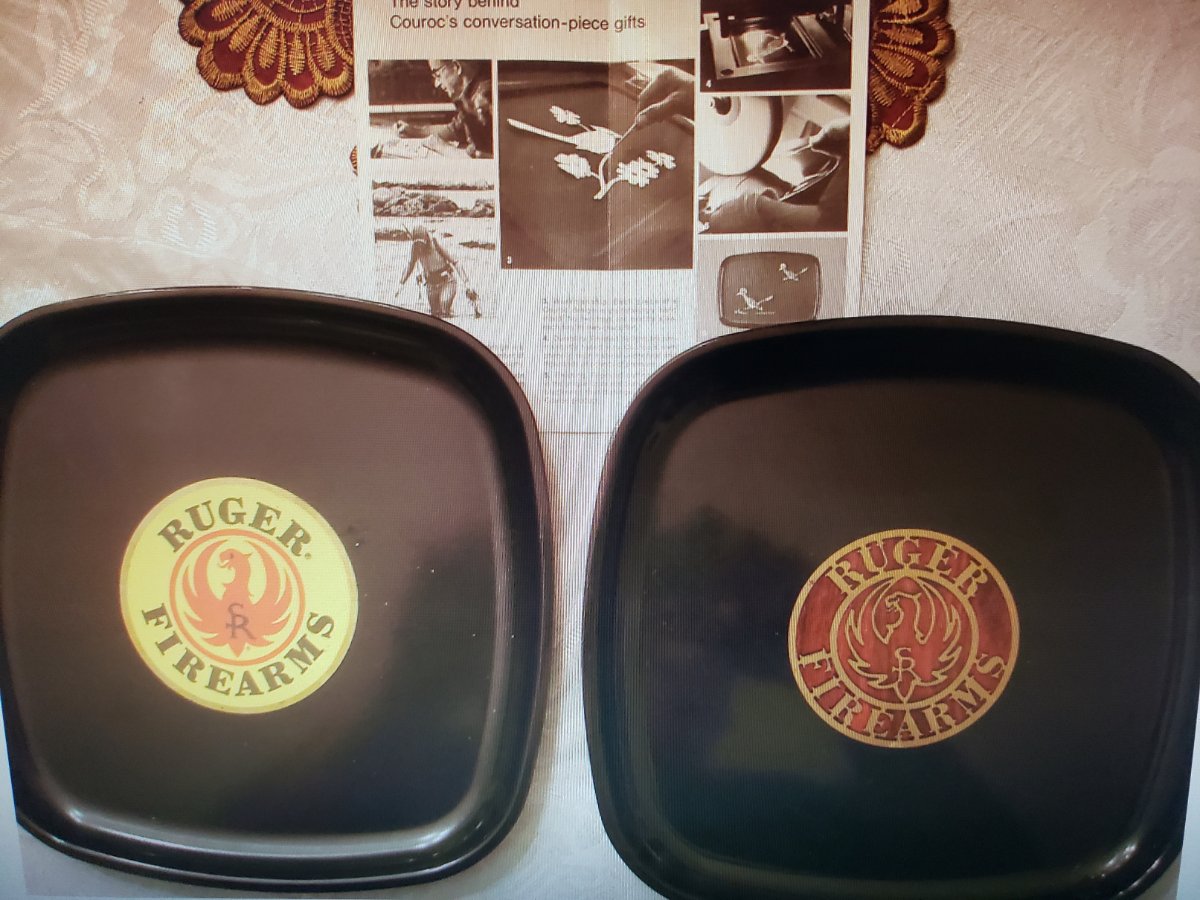 Ruger gave out these couroc trays. The most common known are the ones with the yellow logo. The one on rightbis only one I know of. It has a wood grain pattern. On the back in a white grease pencil it has sample written on it.