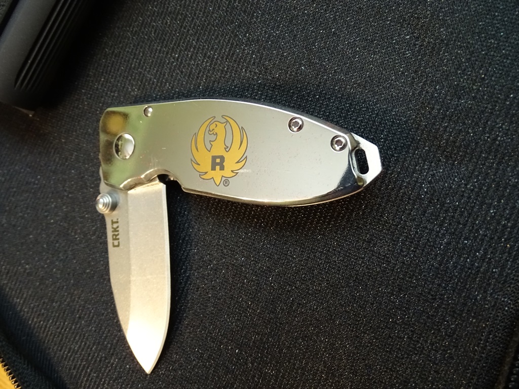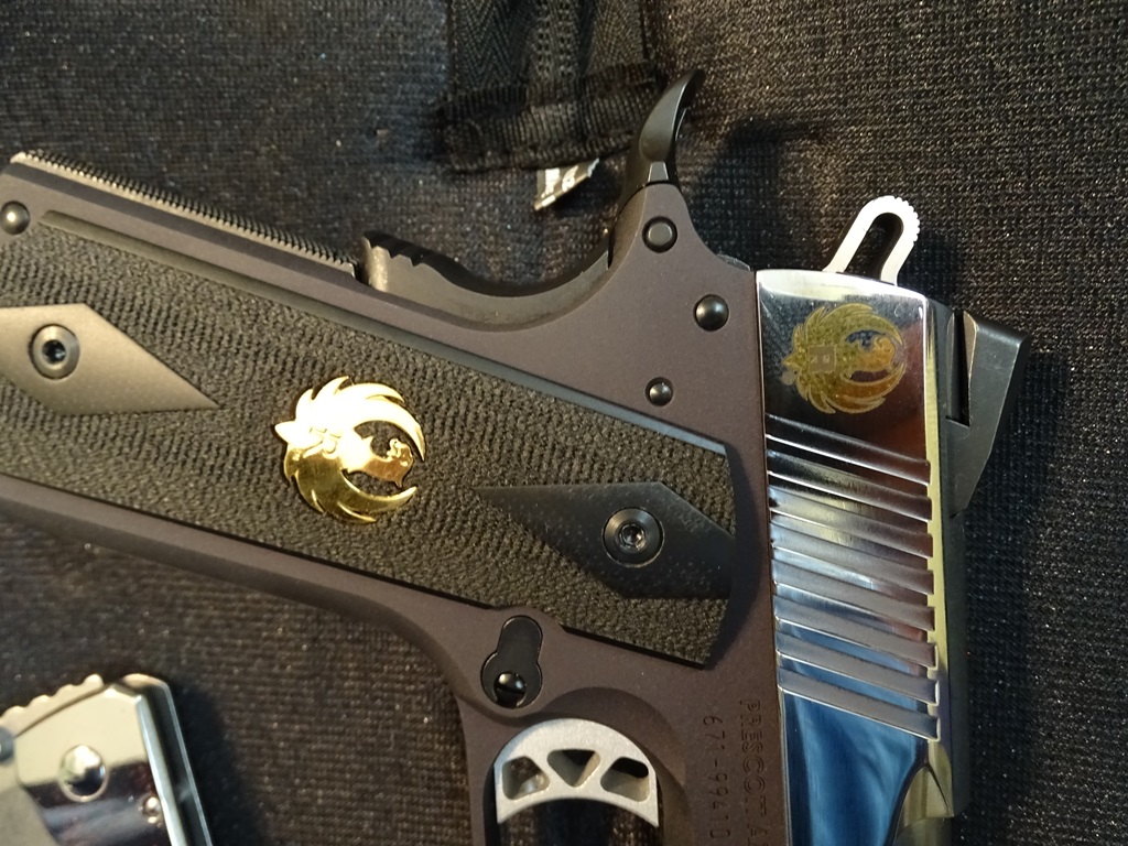 Ruger's newest edition to their SR1911 line-up is the model 6716, cat# SR1911CMD-ANM, listed as a "Ruger Deluxe Commander Carry Combo". This is a Talo exclusive with the custom work done by Barons, only 100 produced. It has a bright polished stainless steel slide with 24K gold Ruger logo bordered by a fine engraved line. Special thin textured black double diamond grips with unique gold Ruger medallion. Packaged with a CRKT Squid folding pocket knife with a 2.25" blade, a bright polished stainless handle with matching 24K gold Ruger logo bordered with a fine engraved line. The knife was designed by Lucas Burley of New Mexico.