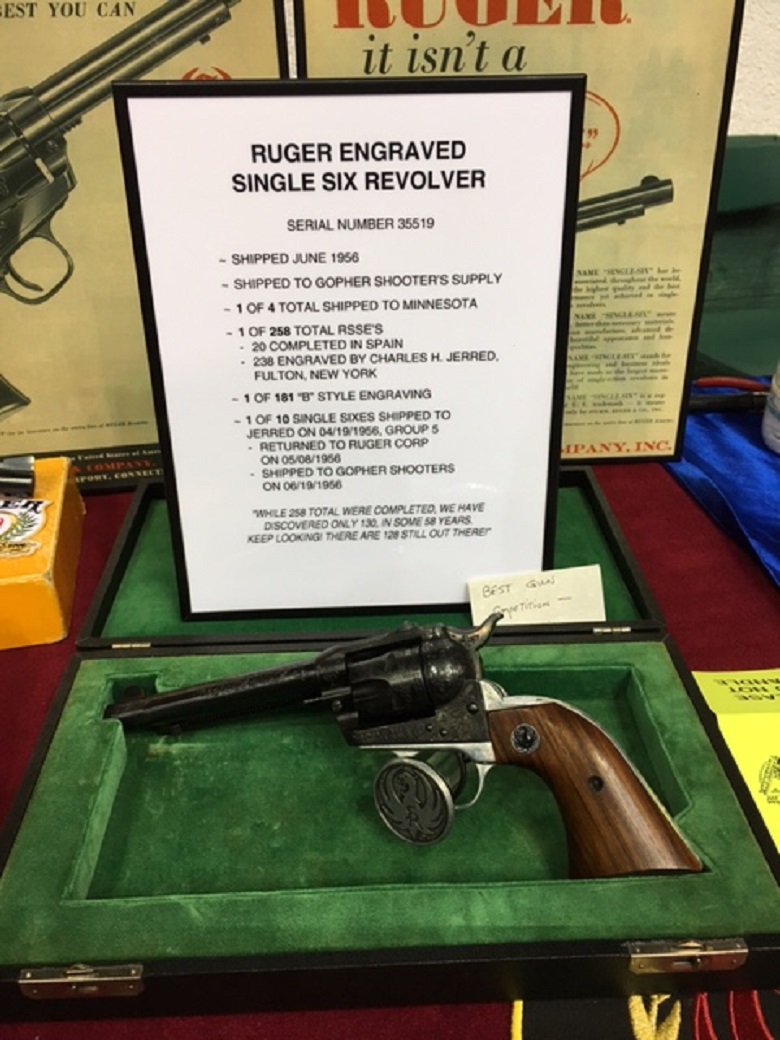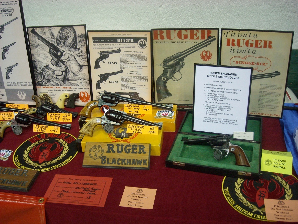 Titled "Ruger Blackhawk Flattops, The Long & The Short of It". Mike's display consisted of Factory stags on 11 of the revolvers, .44 & .357 Flattops in every barrel length , an RSSE, plus a Tri-color Light Weight. Lots of related memorabilia and accessories. Mike won $150 for 2nd place in the modern handgun division.