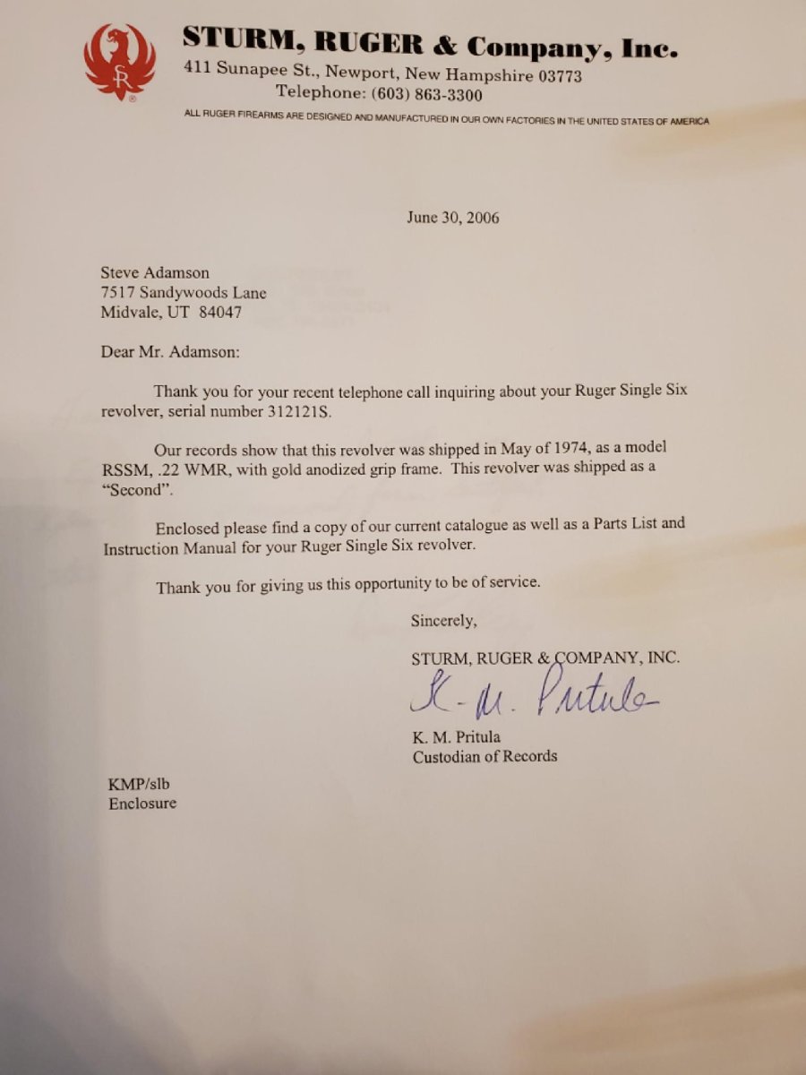 27xxx serial number Ruger 44 mag flattop with 6.5 inch barrel. This revolver is original finish but has an old model unfluted Super Blackhawk cylinder, and old model XR3red grip frame. The cylinder and grip frame were added later, did not leave factory that way. Nice shape, makes a great shooter as ...
