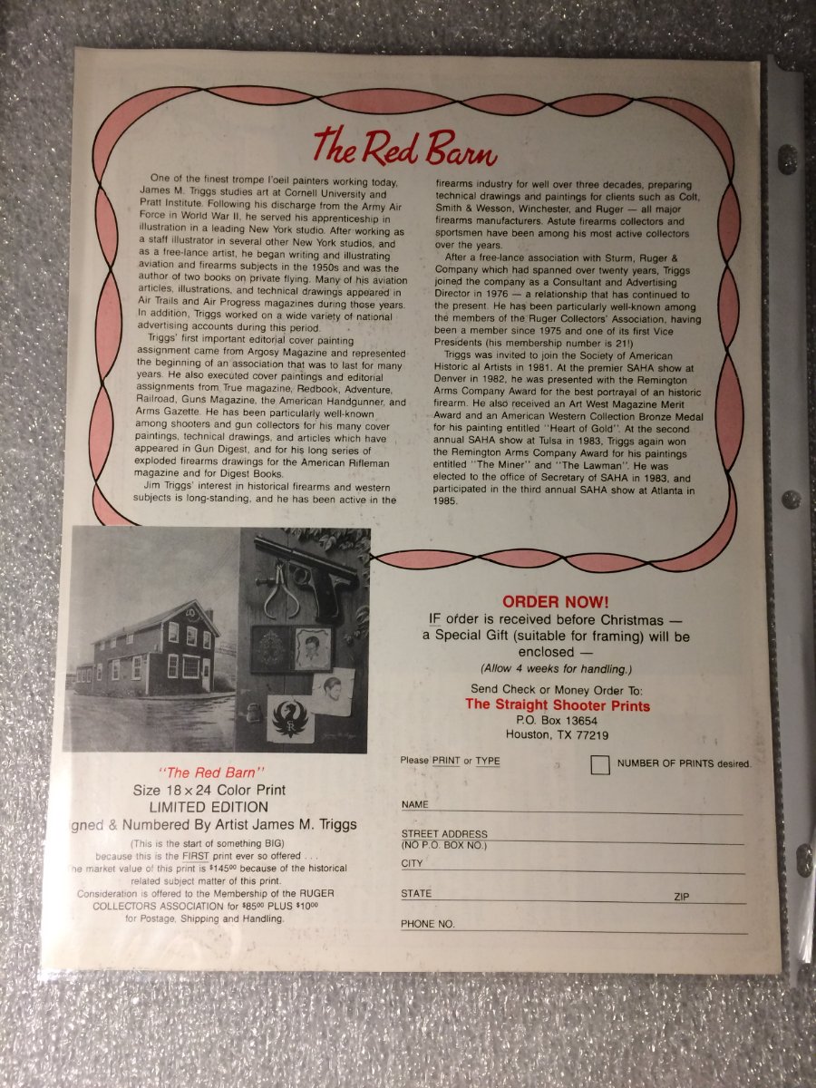 I will work on digging out more Red Barn memorabilia this evening as I'm certain there is more here in my collection besides what's been shown above. Here's the original black and white advertisement for a special limited signed and numbered to 1500 run of The Red Barn print by James Triggs. This link viewtopic.php?t=864 will show you the actual print #258 owned by one of our members. This print was a Christmas offering from 1986. There is a red color version of this brochure as well but I can't seem to find mine at this time. If anyone is willing to part with one of these prints please contact me! I don't care what number it is but I would love to have one on the wall.