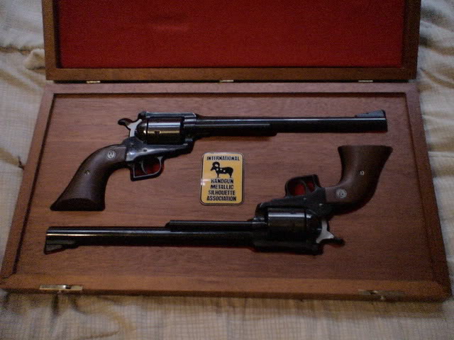 A fellow has a post on Ruger.forum asking info on a set of 10 1/2" "International Handgun Metallic Silhouette Association". I know I've seen the singles but this is a pair in a Mahogany Display case, and my copy of R.E.N.E. states nothing about a set of them. Anyone know anything about them? Here's a link and to the post and a pic from it. https://rugerforum.net/ruger-single-act ... hawks.html