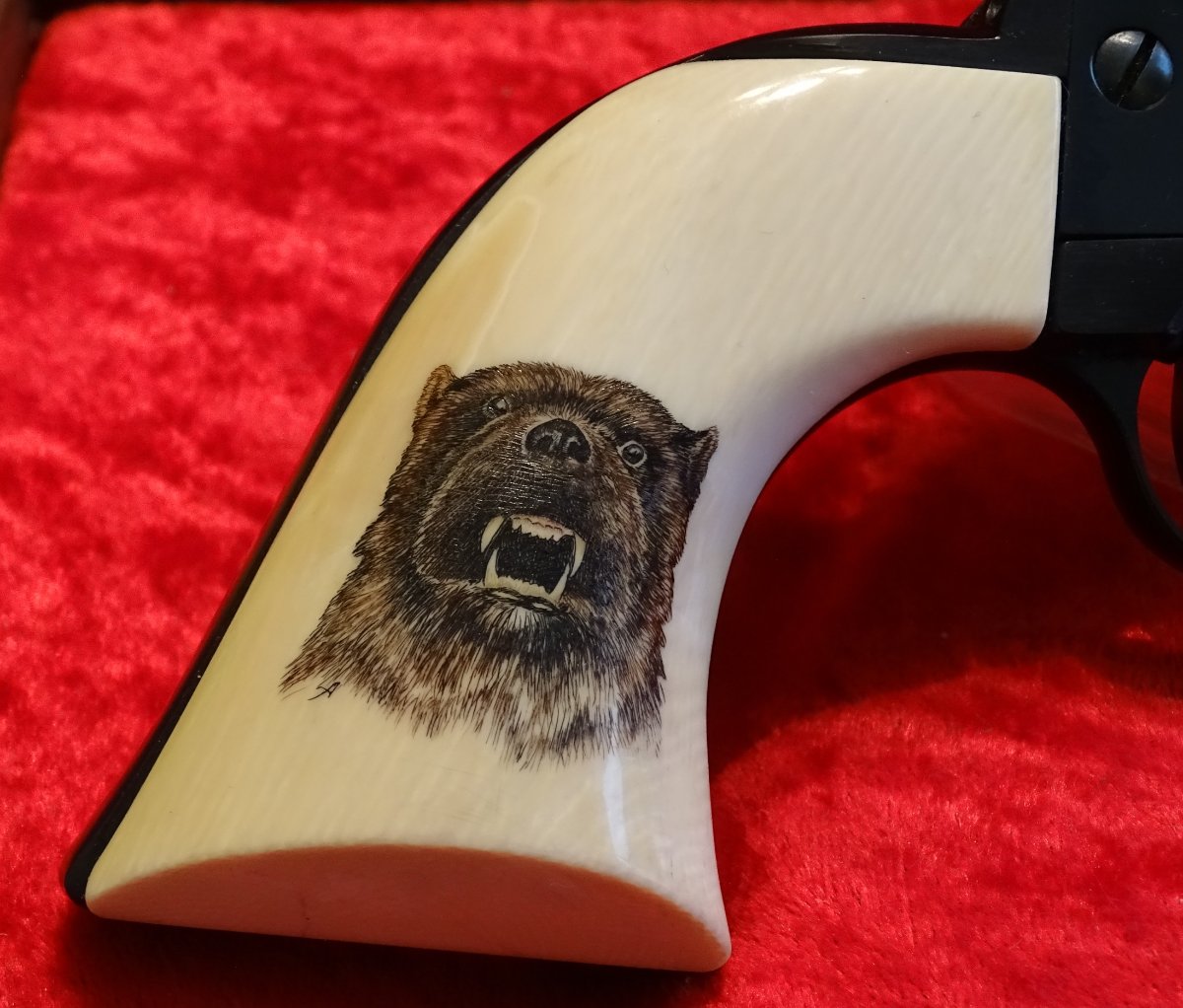 The ivory grip panels are for an XR3RED frame, so I thought they would look great on this Hi-Polished Flat-Top. They have a "Scrimshawed" Wolverine in the right panel.