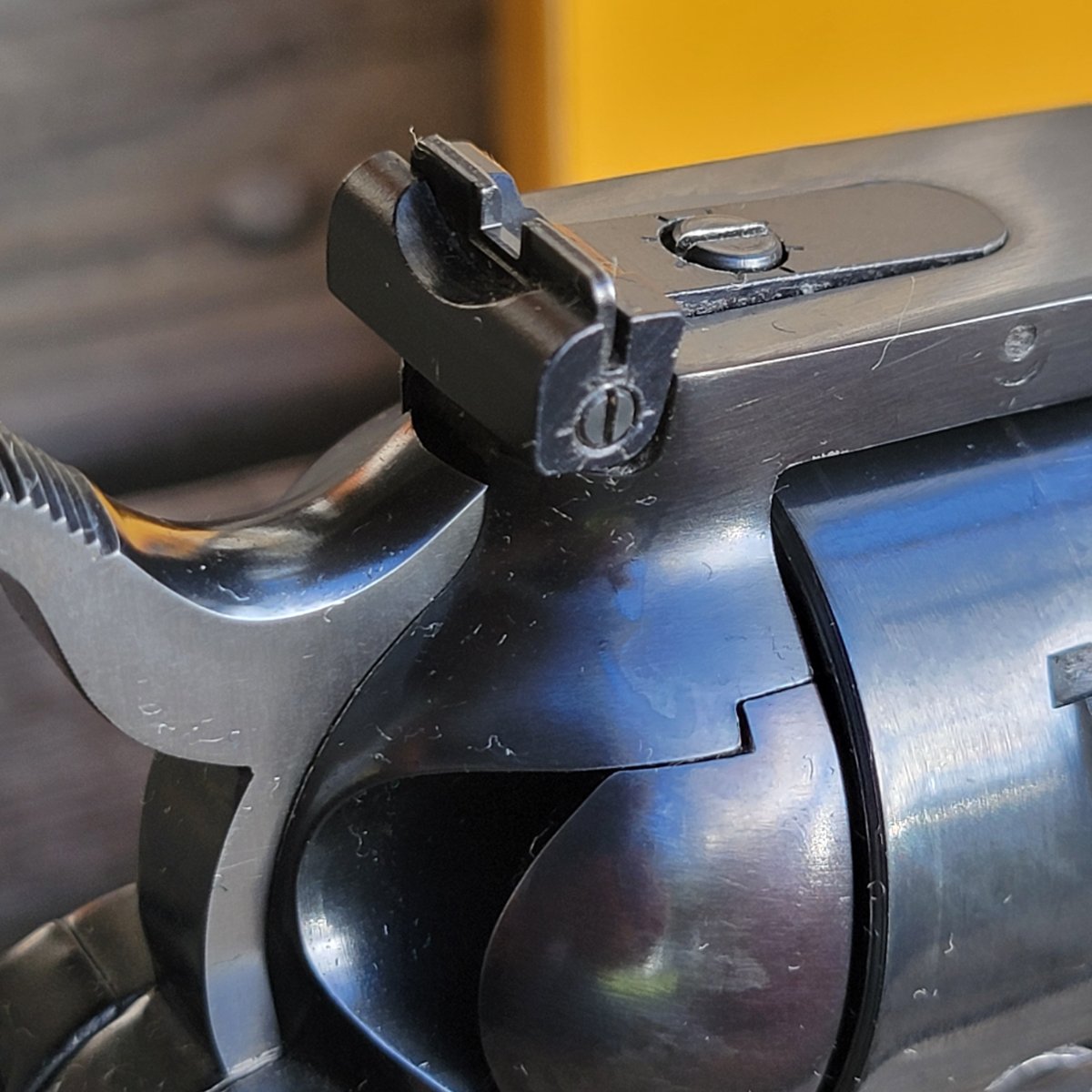 Just picked up an interesting .44 flattop. First noticed the rear sight is not marked with the MICRO stamping. Second serial number falls in the 7 1/2" barrel length but this one is clearly a 6 1/2". Also steel ejector rod housing 'strait' with collared cylinder pin. Upon looking further and sending pics of the rear sight it was noticed that the area the rear blade fits instead of being square front and rear the rear area is rounded. Two other collectors seem to think that this sight is a prototype sight orinally for the super blackhawk. I think a factory letter is due on this one.